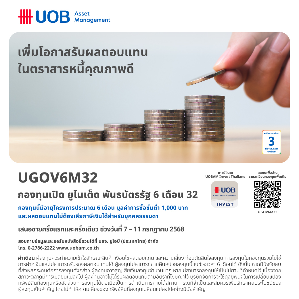 บริษัทหลักทรัพย์จัดการกองทุน ยูโอบี (ประเทศไทย) จำกัด หรือ บลจ.ยูโอบี ได้เสนอขายหน่วยลงทุนครั้งแรก (IPO) กองทุนเปิด ยูไนเต็ด พันธบัตรรัฐ 6 เดือน 32 (UGOV6M32) อายุประมาณ 6 เดือน มีประมาณการผลตอบแทน 1.30% ต่อปี (ข้อมูลจากอัตราผลตอบแทนที่เสนอโดยผู้ออกตราสาร หรือจากผู้ขาย ณ วันที่ 1 กรกฎาคม 2568) ขนาดโครงการ 10,000 ล้านบาท โดยเสนอขายในราคา 10 บาทต่อหน่วย และยอดลงทุนขั้นต่ำครั้งแรก 1,000 บาท