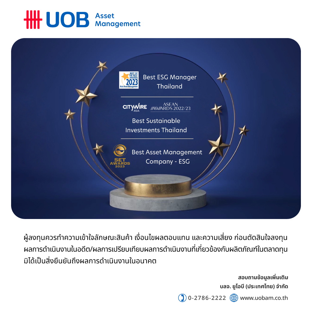 ในช่วงหลายปีที่ผ่านมา บลจ.ยูโอบี ได้มีส่วนร่วมในการผลักดันการนำเอาปัจจัย ESG เข้ามาผนวกเป็นส่วนหนึ่งในการบริหารการลงทุน ในปี 2023 นี้ เราได้รับ 3 รางวัลด้าน ESG ทั้งจากสถาบันทั้งในและต่างประเทศ รางวัลดังกล่าวเป็นการตอกย้ำความเชื่อมั่นความเป็นผู้นำด้าน ESG ของเรา บลจ.ยูโอบี จึงมีความยินดีที่จะเข้าร่วมสนับสนุนนโยบายดังกล่าว เพื่อสนับสนุนภาพรวมการลงทุนในหลายๆ มิติ ทั้งในด้านนักลงทุนได้มีโอกาสออมเงินไว้ใช้จ่ายในอนาคต ตลาดหุ้นไทยให้มีความแข็งแรงขึ้น โดยเฉพาะการสนับสนุนธุรกิจที่คำนึงถึงปัจจัย ESG จึงได้จัดเตรียมเสนอขาย กองทุนเปิด ยูไนเต็ด หุ้นไทย ซัสเทนเนเบิล (UTSEQ) เน้นลงทุนในหุ้นไทยที่เป็นไปตามหลักเกณฑ์การประเมินหุ้นยั่งยืน SET ESG Rating ที่มีการประกาศล่าสุด https://setsustainability.com/ESG-ratings มีกลยุทธ์การบริหาร เพื่อมุ่งหวังให้ผลประกอบการเคลื่อนไหวสูงกว่าดัชนีชี้วัด (Active Management) และมีการนำเอาปัจจัย ESG เข้ามาผนวกในกระบวนการลงทุน นอกจากนี้กองทุน UTSEQ ยังเป็นไปตามหลักเกณฑ์ของ กองทุนรวมเพื่อความยั่งยืน (SRI Fund) ซึ่งเป็นกองทุนรวมที่มีการเปิดเผยข้อมูลในโครงการและหนังสือชี้ชวนว่ามีการจัดการกองทุนรวมโดยมุ่งความยั่งยืน (Sustainability) ตามหลักสากลอีกด้วย