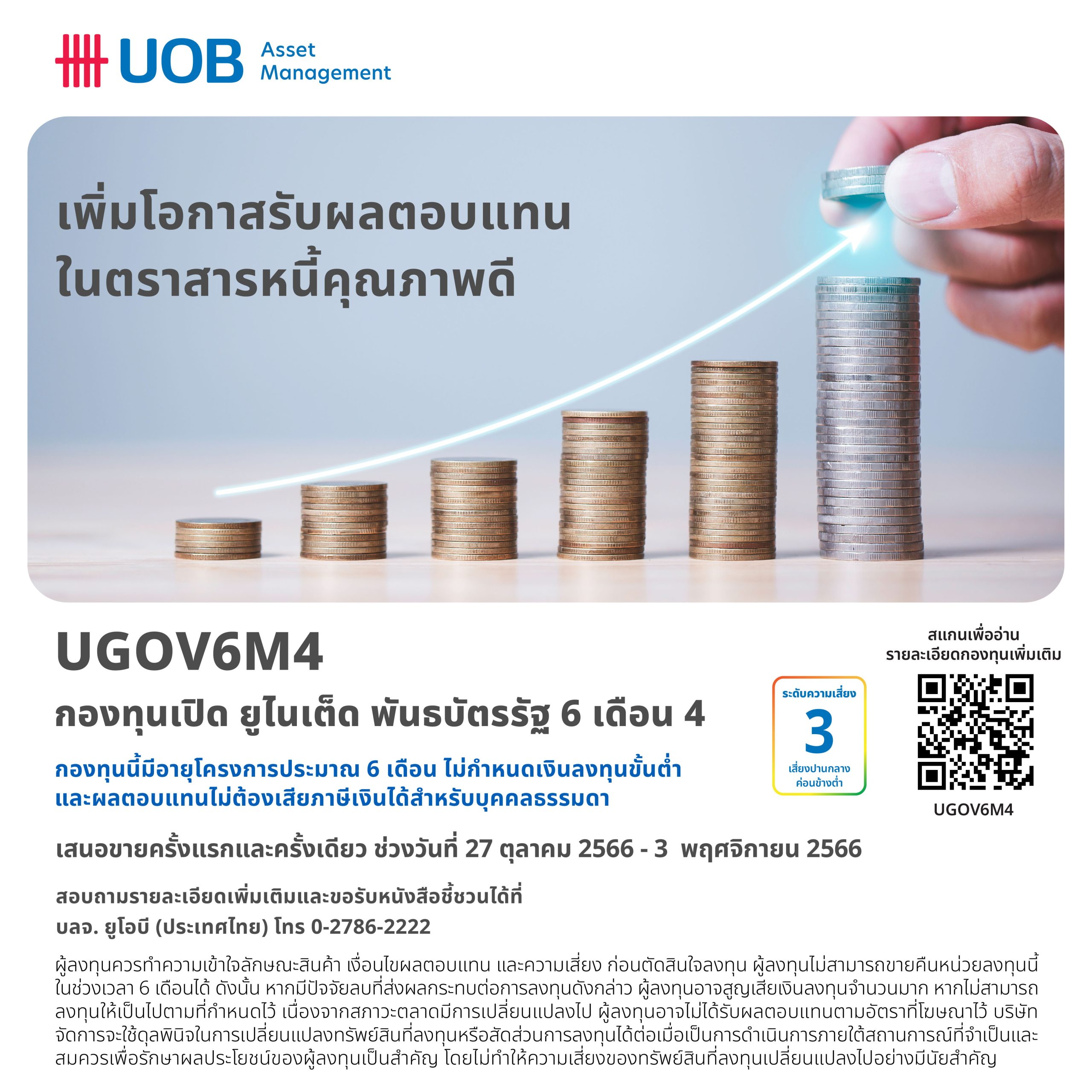 บริษัทหลักทรัพย์จัดการกองทุนรวม ยูโอบี (ประเทศไทย) จำกัด หรือ บลจ.ยูโอบี ได้เสนอขายหน่วยลงทุนครั้งแรก (IPO) กองทุนเปิด ยูไนเต็ด พันธบัตรรัฐ 6 เดือน 4 (UGOV6M4) อายุประมาณ 6 เดือน ประมาณการผลตอบแทน 2.15% ต่อปี (ข้อมูลจากอัตราผลตอบแทนที่เสนอโดยผู้ออกตราสาร หรือจากผู้ขาย ณ วันที่ 19 ตุลาคม 2566) ขนาดโครงการ 5,000 ล้านบาท โดยเสนอขายในราคา 10 บาทต่อหน่วย และไม่มีกำหนดยอดลงทุนขั้นต่ำ