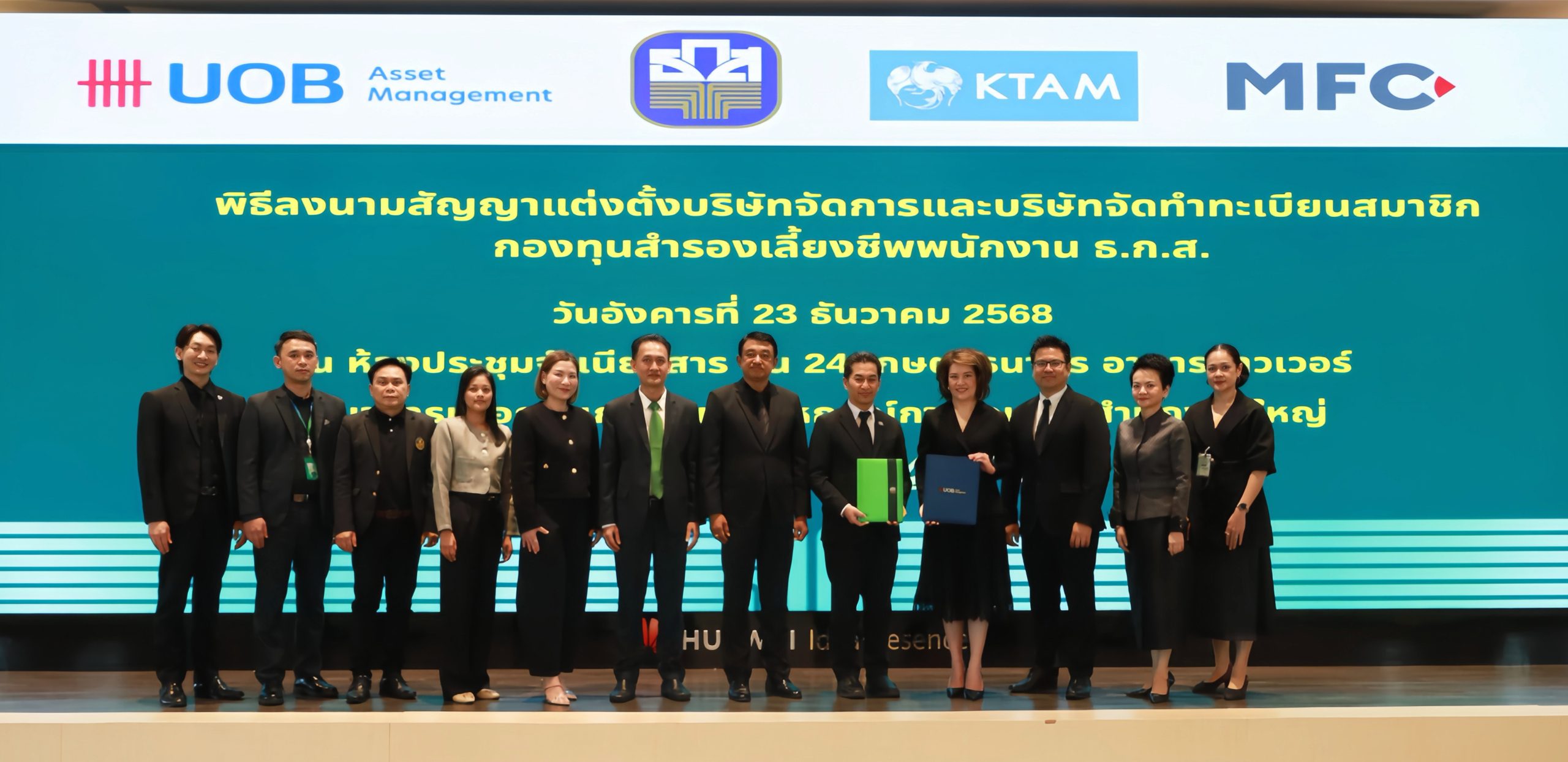 พิธีลงนามสัญญาจัดการกองทุน โดยได้รับเกียรติจาก คุณเกรียงไกร กัลหะรัตน์ (ลำดับ 5 จากขวา) ประธานกรรมการ และคุณจรัญ เรอุไร (ลำดับ 6 จากขวา) กรรมการกองทุนสำรองเลี้ยงชีพพนักงาน ธนาคารเพื่อการเกษตรและสหกรณ์การเกษตร ซึ่งจดทะเบียนแล้ว ร่วมลงนามสัญญากับ บลจ.ยูโอบี (ประเทศไทย) จำกัด ได้แก่ คุณรัชดา ตั้งหะรัฐ (ลำดับ 4 จากขวา) รองประธานเจ้าหน้าที่บริหาร พร้อมกับทีมผู้บริหาร ได้แก่ คุณกุลฉัตร จันทวิมล (ลำดับ 3 จากขวา) กรรมการผู้จัดการ สายพัฒนาธุรกิจ, คุณกุสุมาพร หิรัณยัษฐิติ (ลำดับ 2 จากขวา) ผู้ช่วยกรรมการผู้จัดการ ฝ่ายธุรกิจลูกค้าสถาบันและธุรกิจกองทุนสำรองเลี้ยงชีพ และคุณวรรณอนงค์ จิระพัฒนะชัย (ขวา) ผู้อำนวยการอาวุโส ฝ่ายธุรกิจลูกค้าสถาบันและธุรกิจกองทุนสำรองเลี้ยงชีพ โดย บลจ.ยูโอบี (ประเทศไทย) ได้รับความไว้วางใจแต่งตั้งให้เป็นหนึ่งในบริษัทจัดการการลงทุนเพื่อเข้าบริหารกองทุนสำรองเลี้ยงชีพพนักงาน ธนาคารเพื่อการเกษตรและสหกรณ์การเกษตร ซึ่งจดทะเบียนแล้ว ซึ่งมีขนาดกองทุนมูลค่ากว่า 12,000 ล้านบาท โดย บลจ.ยูโอบี (ประเทศไทย) ได้รับมอบหมายให้จัดการลงทุนทั้ง 2 กลุ่มนโยบายการลงทุน ได้แก่ การลงทุนในประเทศ และการลงทุนในต่างประเทศ เริ่มมีผลตั้งแต่วันที่ 1 มกราคม 2569 ถึงวันที่ 31 ธันวาคม 2571