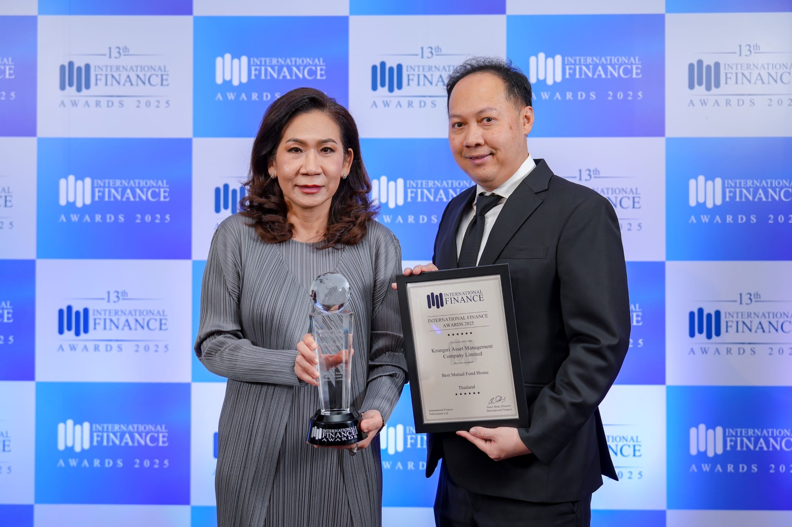 คุณสุภาพร ลีนะบรรจง กรรมการผู้จัดการ และคุณศิระ คล่องวิชา ประธานเจ้าหน้าที่กลุ่มการลงทุน บลจ.กรุงศรี จำกัด รับรางวัล Best Mutual Fund House – Thailand 2568 ซึ่งนับเป็นปีที่ 5 ติดต่อกัน จาก International Finance นิตยสารด้านธุรกิจและการเงินชั้นนำระดับโลกจากประเทศอังกฤษ สะท้อนถึงการที่บริษัทมีผลการดำเนินงานและการเติบโตของธุรกิจที่โดดเด่น รวมทั้งนวัตกรรมบริการและผลิตภัณฑ์ต่างๆ อย่างต่อเนื่อง