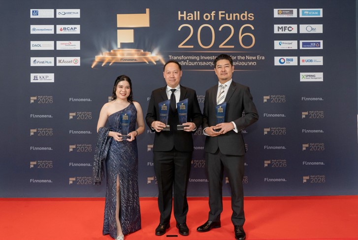 คุณศิระ คล่องวิชา ประธานเจ้าหน้าที่กลุ่มการลงทุน คุณพรทิพา หนึ่งน้ำใจ ประธานเจ้าหน้าที่ฝ่ายการลงทุนตราสารหนี้ และคุณจาตุรันต์ สอนไว ประธานเจ้าหน้าที่ฝ่ายการลงทุนต่างประเทศ บลจ.กรุงศรี จำกัด รับรางวัล “Global Bond Fully F/X Hedge” จากกองทุน KF-SINCOME (ได้รับเป็นปีที่ 2) รางวัล “Mid Term General Bond” จากกองทุน KFAFIX-A รางวัล “Fund of Property Fund – Foreign” จากกองทุน KFGPROP-A (ได้รับเป็นปีที่ 2) และรางวัล “China Equity – A Shares” จากกองทุน KF-ACHINA-A ซึ่งจัดขึ้นในงาน Hall of Funds 2026 by Finnomena สะท้อนให้เห็นถึงความโดดเด่นในการสร้างผลตอบแทนที่ดี และการบริหารจัดการกองทุน ณ โรงแรม Pullman Bangkok King Power เมื่อเร็ว ๆ นี้