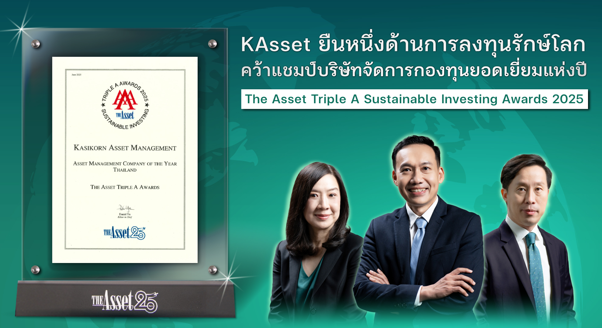 บริษัทหลักทรัพย์จัดการกองทุน กสิกรไทย จำกัด (บลจ.กสิกรไทย) ได้รับรางวัล Asset Management Company of the Year – Sustainable Investing จากเวที The Asset Triple A Awards 2025 ซึ่งสะท้อนถึงความมุ่งมั่นอย่างต่อเนื่องของ บลจ.กสิกรไทย ในการดำเนินธุรกิจภายใต้แนวทางการลงทุนอย่างยั่งยืน โดยเน้นผลลัพธ์ที่เป็นรูปธรรมในทุกมิติของ ESG เพื่อยกระดับมาตรฐานการลงทุนของไทยให้ทัดเทียมกับระดับสากล โดยนายวิน พรหมแพทย์ CFA, ประธานกรรมการบริหาร พร้อมด้วยนายวจนะ วงศ์ศุภสวัสดิ์ CFA, กรรมการผู้จัดการ และนางสาวธิดาศิริ ศรีสมิต CFA, Chief Investment Officer บลจ.กสิกรไทย เป็นตัวแทนร่วมแสดงความยินดีกับความสำเร็จในครั้งนี้