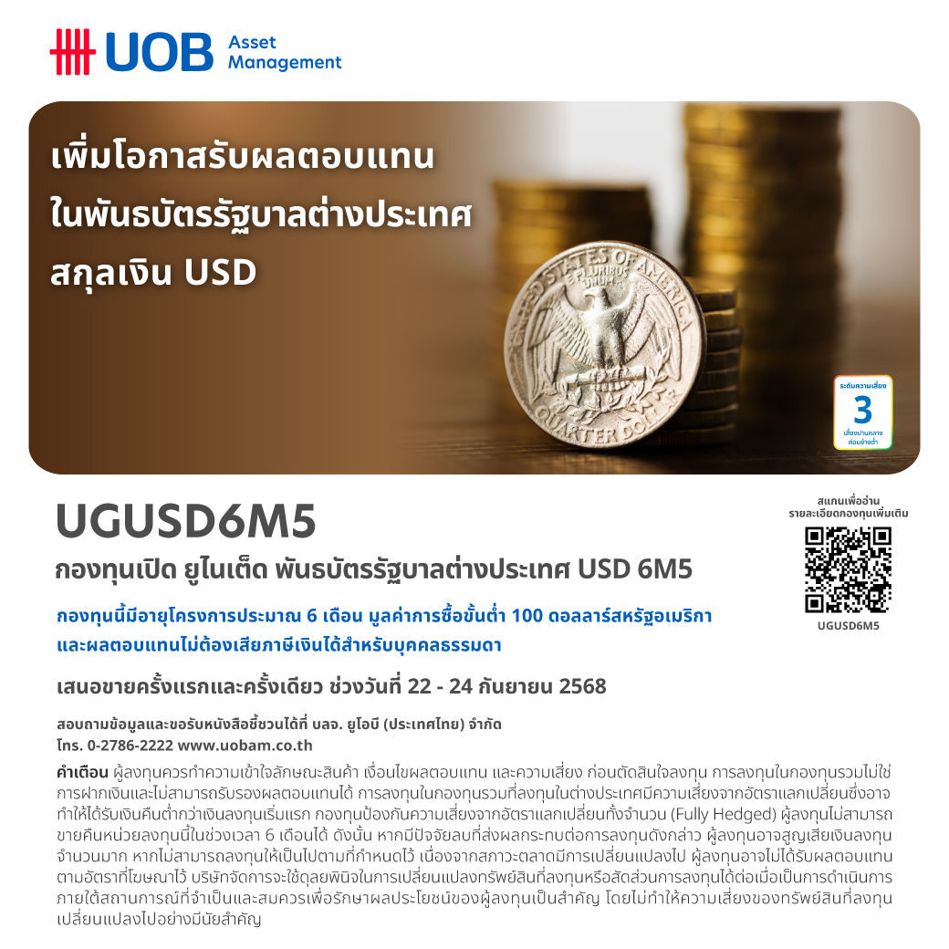บริษัทหลักทรัพย์จัดการกองทุน ยูโอบี (ประเทศไทย) จำกัด หรือ บลจ.ยูโอบี ได้เสนอขายหน่วยลงทุนครั้งแรก (IPO) กองทุนเปิด ยูไนเต็ด พันธบัตรรัฐบาลต่างประเทศ USD 6M5 (UGUSD6M5) อายุประมาณ 6 เดือน มีประมาณการผลตอบแทน 3.60% ต่อปี (ข้อมูลจากอัตราผลตอบแทนที่เสนอโดยผู้ออกตราสาร หรือจากผู้ขาย ณ วันที่ 18 กันยายน 2568) กองทุนมีขนาดโครงการ 200 ล้านดอลลาร์สหรัฐ โดยเสนอขายในราคา 10 ดอลลาร์สหรัฐต่อหน่วย และยอดลงทุนครั้งแรกขั้นต่ำ 100 ดอลลาร์สหรัฐ