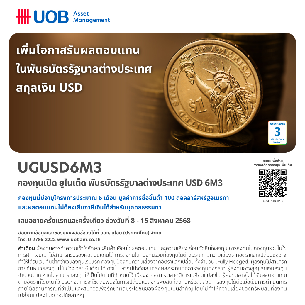บริษัทหลักทรัพย์จัดการกองทุน ยูโอบี (ประเทศไทย) จำกัด หรือ บลจ.ยูโอบี ได้เสนอขายหน่วยลงทุนครั้งแรก (IPO) กองทุนเปิด ยูไนเต็ด พันธบัตรรัฐบาลต่างประเทศ USD 6M3 (UGUSD6M3) อายุประมาณ 6 เดือน มีประมาณการผลตอบแทน 3.95% ต่อปี (ข้อมูลจากอัตราผลตอบแทนที่เสนอโดยผู้ออกตราสาร หรือจากผู้ขาย ณ วันที่ 5 สิงหาคม 2568) กองทุนมีขนาดโครงการ 200 ล้านดอลลาร์สหรัฐ โดยเสนอขายในราคา 10 ดอลลาร์สหรัฐต่อหน่วย และยอดลงทุนครั้งแรกขั้นต่ำ 100 ดอลลาร์สหรัฐ