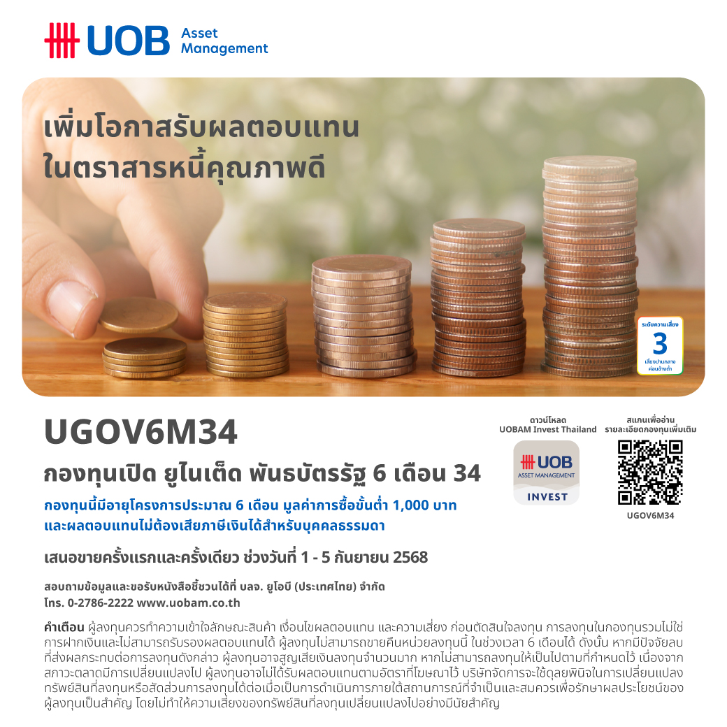 บริษัทหลักทรัพย์จัดการกองทุน ยูโอบี (ประเทศไทย) จำกัด หรือ บลจ.ยูโอบี ได้เสนอขายหน่วยลงทุนครั้งแรก (IPO) กองทุนเปิด ยูไนเต็ด พันธบัตรรัฐ 6 เดือน 34 (UGOV6M34) อายุประมาณ 6 เดือน มีประมาณการผลตอบแทน 1.15% ต่อปี (ข้อมูลจากอัตราผลตอบแทนที่เสนอโดยผู้ออกตราสาร หรือจากผู้ขาย ณ วันที่ 26 สิงหาคม 2568 ขนาดโครงการ 10,000 ล้านบาท โดยเสนอขายในราคา 10 บาทต่อหน่วย และยอดลงทุนขั้นต่ำครั้งแรก 1,000 บาท