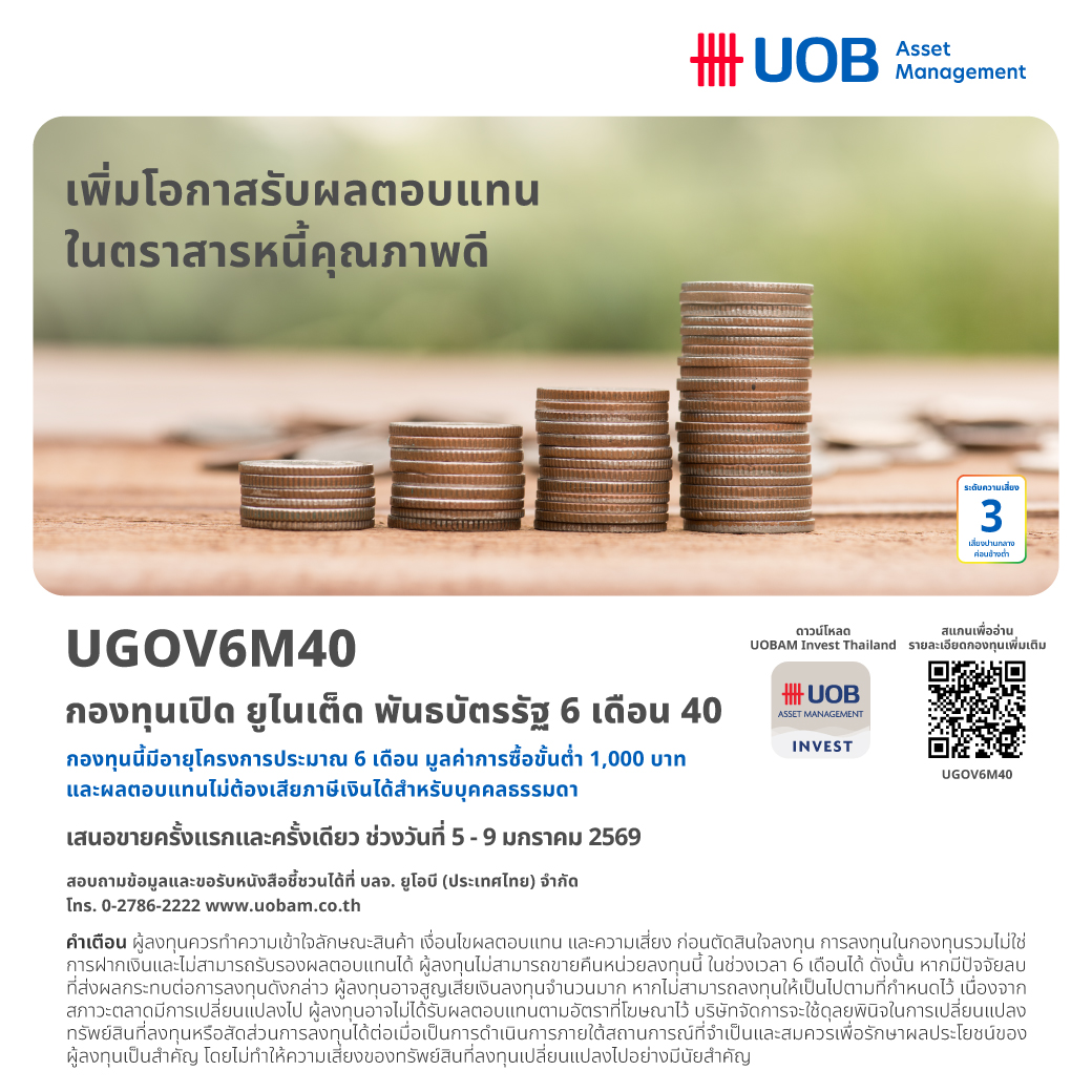 บริษัทหลักทรัพย์จัดการกองทุน ยูโอบี (ประเทศไทย) จำกัด หรือ บลจ.ยูโอบี ได้เสนอขายหน่วยลงทุนครั้งแรก (IPO) กองทุนเปิด ยูไนเต็ด พันธบัตรรัฐ 6 เดือน 40 (UGOV6M40) อายุประมาณ 6 เดือน มีประมาณการผลตอบแทน 0.90% ต่อปี (ข้อมูลจากอัตราผลตอบแทนที่เสนอโดยผู้ออกตราสาร หรือจากผู้ขาย ณ วันที่ 29 ธันวาคม 2568 ขนาดโครงการ 10,000 ล้านบาท โดยเสนอขายในราคา 10 บาทต่อหน่วย และยอดลงทุนขั้นต่ำครั้งแรก 1,000 บาท