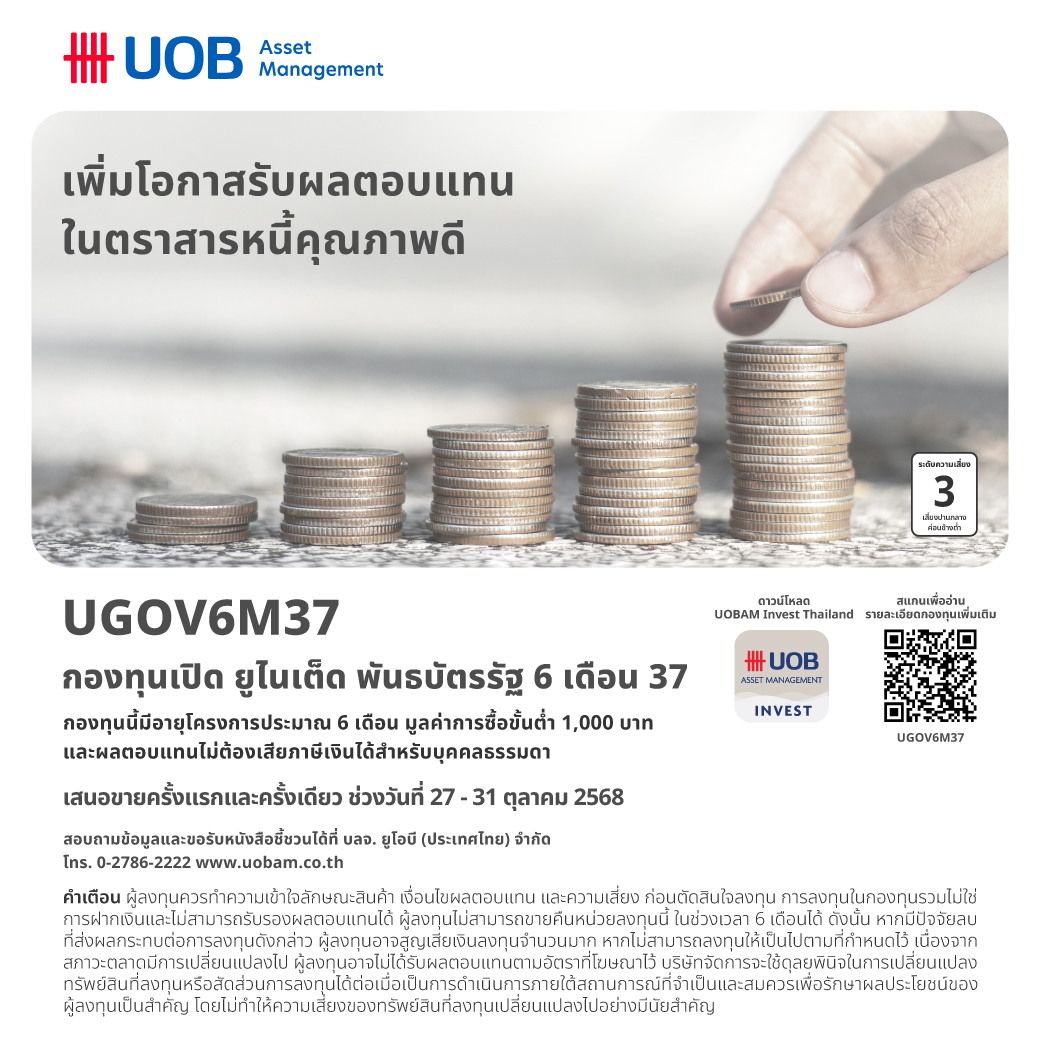 บริษัทหลักทรัพย์จัดการกองทุน ยูโอบี (ประเทศไทย) จำกัด หรือ บลจ.ยูโอบี ได้เสนอขายหน่วยลงทุนครั้งแรก (IPO) กองทุนเปิด ยูไนเต็ด พันธบัตรรัฐ 6 เดือน 37 (UGOV6M37) อายุประมาณ 6 เดือน มีประมาณการผลตอบแทน 1.05% ต่อปี (ข้อมูลจากอัตราผลตอบแทนที่เสนอโดยผู้ออกตราสาร หรือจากผู้ขาย ณ วันที่ 21 ตุลาคม 2568) ขนาดโครงการ 10,000 ล้านบาท โดยเสนอขายในราคา 10 บาทต่อหน่วย และยอดลงทุนขั้นต่ำครั้งแรก 1,000 บาท