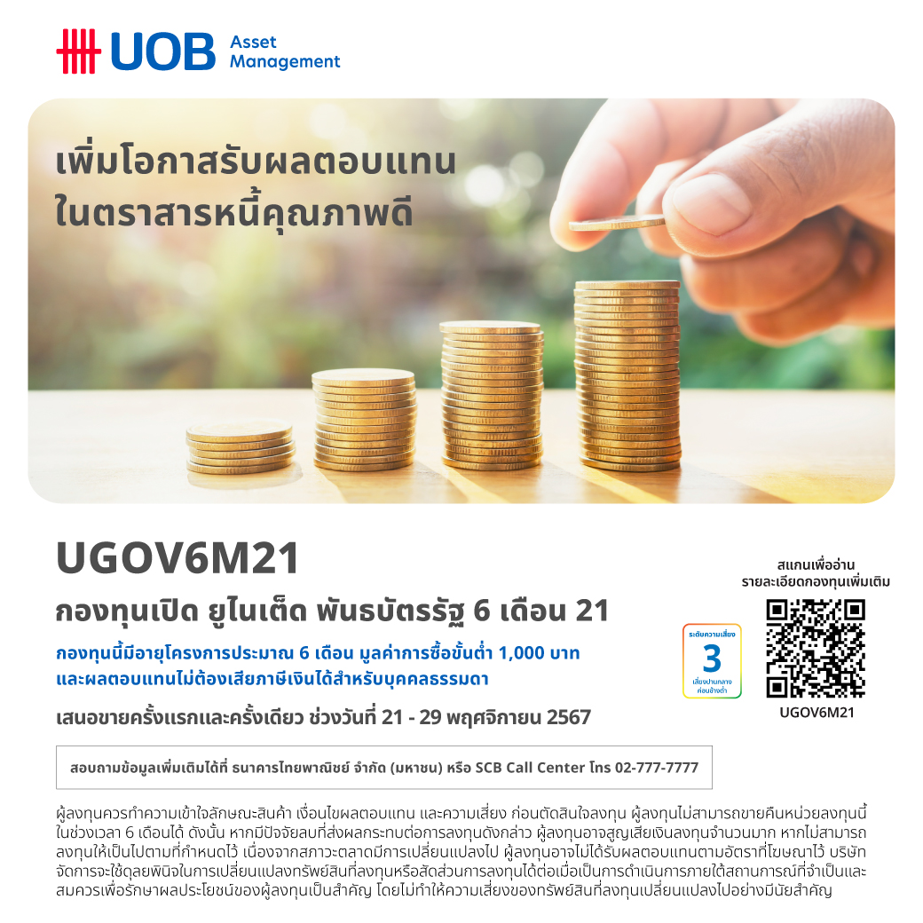 บริษัทหลักทรัพย์จัดการกองทุนรวม ยูโอบี (ประเทศไทย) จำกัด หรือ บลจ.ยูโอบี  ได้เสนอขายหน่วยลงทุนครั้งแรก (IPO) กองทุนเปิด ยูไนเต็ด พันธบัตรรัฐ 6 เดือน 21 (UGOV6M21อายุประมาณ 6 เดือน ให้กับลูกค้าของ ธนาคารไทยพาณิชย์ จำกัด (มหาชน)  UGOV6M21 มีประมาณการผลตอบแทน 1.95% ต่อปี (ข้อมูลจากอัตราผลตอบแทนที่เสนอโดยผู้ออกตราสาร หรือจากผู้ขาย ณ วันที่ พฤศจิกายน 2567) ขนาดโครงการ 10,000 ล้านบาท โดยเสนอขายในราคา 10 บาทต่อหน่วย และยอดลงทุนขั้นต่ำ 1,000 บาท