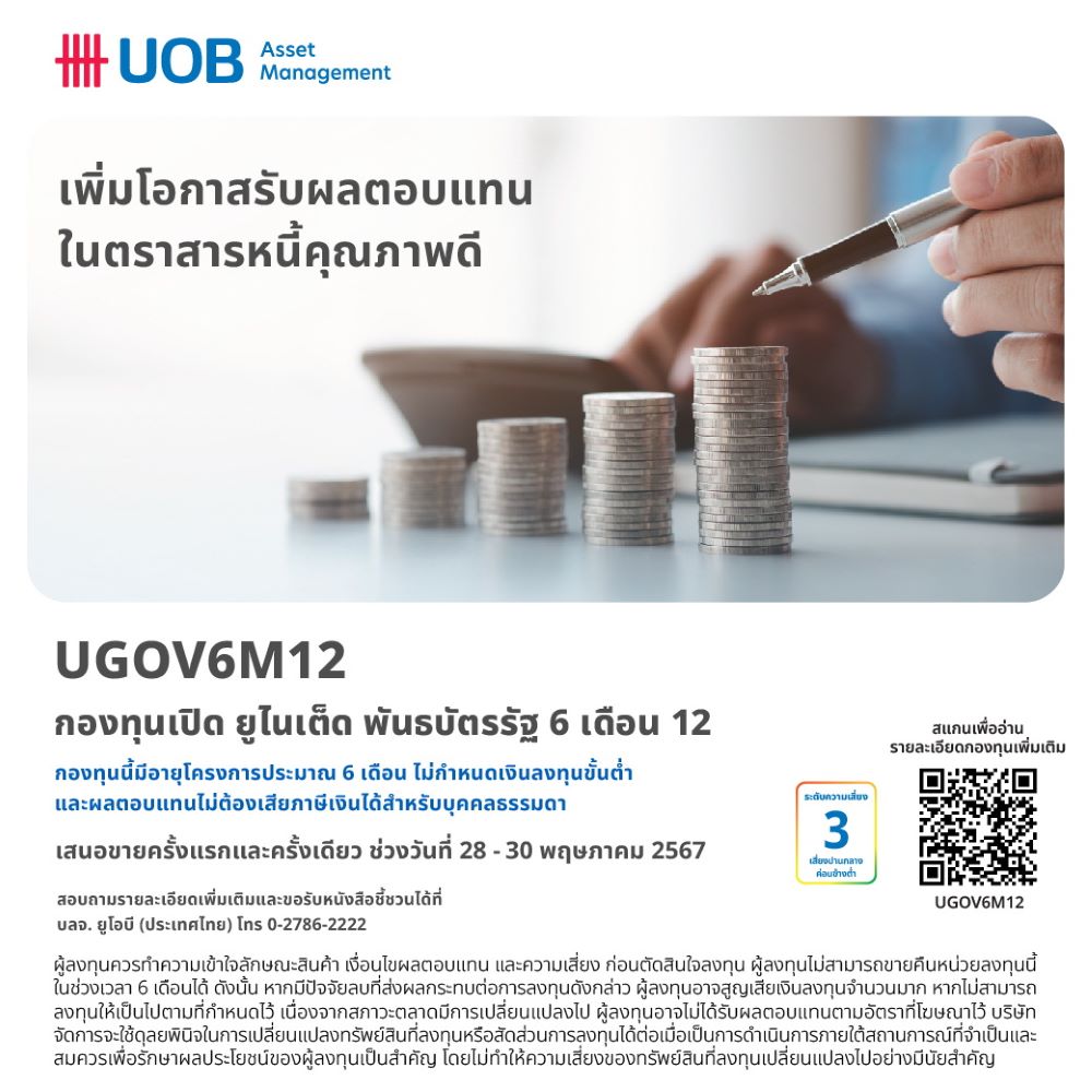บริษัทหลักทรัพย์จัดการกองทุนรวม ยูโอบี (ประเทศไทย) จำกัด หรือ บลจ.ยูโอบี ได้เสนอขายหน่วยลงทุนครั้งแรก (IPO) กองทุนเปิด ยูไนเต็ด พันธบัตรรัฐ 6 เดือน 12 (UGOV6M12) อายุประมาณ 6 เดือน ประมาณการผลตอบแทน 2.05% ต่อปี (ข้อมูลจากอัตราผลตอบแทนที่เสนอโดยผู้ออกตราสาร หรือจากผู้ขาย ณ วันที่ 24 พฤษภาคม 2567) ขนาดโครงการ 10,000 ล้านบาท โดยเสนอขายในราคา 10 บาทต่อหน่วย และไม่มีกำหนดยอดลงทุนขั้นต่ำ