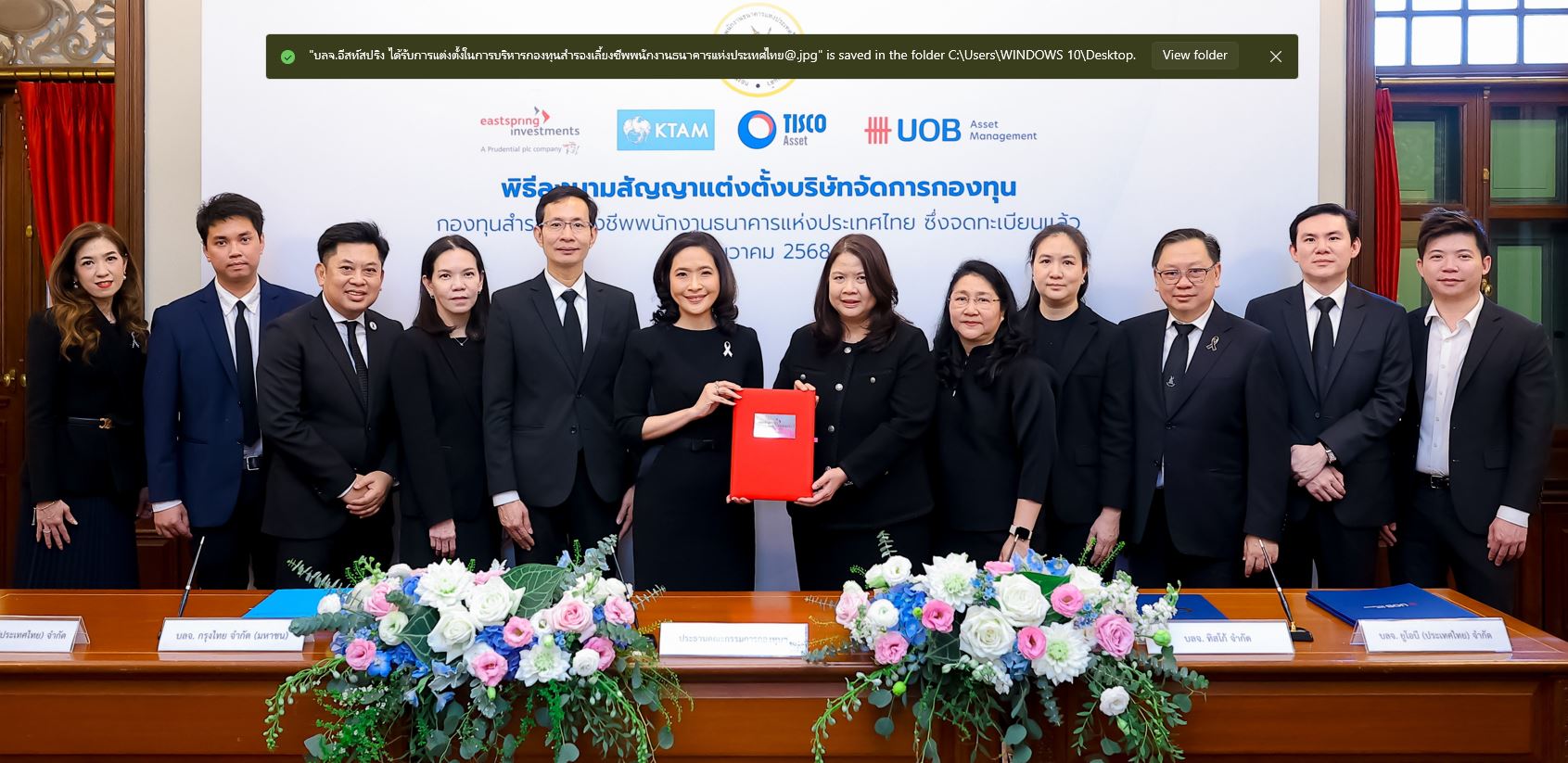 บริษัทหลักทรัพย์จัดการกองทุน อีสท์สปริง (ประเทศไทย) จำกัด หรือ บลจ.อีสท์สปริง ได้รับการแต่งตั้งจาก กองทุนสำรองเลี้ยงชีพพนักงานธนาคารแห่งประเทศไทย ซึ่งจดทะเบียนแล้ว ให้ร่วมเป็นหนึ่งในบริษัทหลักทรัพย์จัดการกองทุน โดยให้บริหาร นโยบายตราสารหนี้ต่างประเทศ และนโยบายตราสารทุนต่างประเทศ มูลค่ารวมกว่า 1,300 ล้านบาท ครอบคลุมระยะเวลา 3 ปี โดยมีผลตั้งแต่วันที่ 1 มกราคม 2569 เป็นต้นไป โดยมีนางสาวดารบุษป์ ปภาพจน์ (ที่ 6 จากซ้าย) กรรมการผู้จัดการ บลจ.อีสท์สปริง ร่วมลงนามสัญญาแต่งตั้งกับนางสมฤดี รังสิยาภรณ์รัตน์ (ที่ 6 จากขวา) ผู้ช่วยผู้ว่าการ ธนาคารแห่งประเทศไทย ในฐานะประธานคณะกรรมการกองทุนสำรองเลี้ยงชีพพนักงานธนาคารแห่งประเทศไทย ซึ่งจดทะเบียนแล้ว พร้อมผู้บริหารทั้ง 2 ฝ่ายร่วมเป็นสักขีพยาน เมื่อเร็วๆ นี้ ณ ตำหนักใหญ่วังเทวะเวศม์ ธนาคารแห่งประเทศไทย สำนักงานใหญ่ บางขุนพรหม