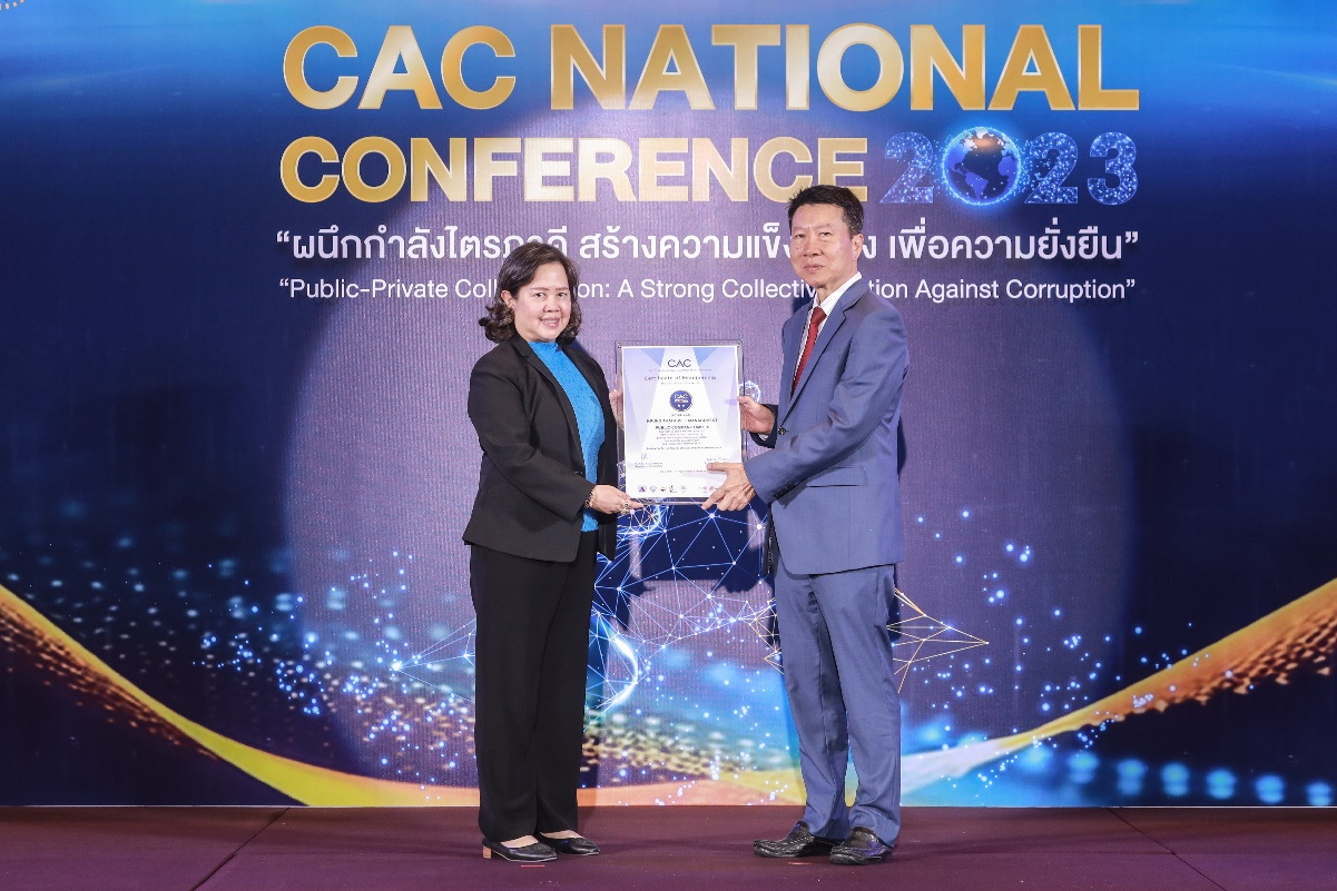 นางสาวหัสวรา แสงรุจิ รองกรรมการผู้จัดการ ผู้บริหารสายงานกองทุนสำรองเลี้ยงชีพ ในฐานะตัวแทน บริษัทหลักทรัพย์จัดการกองทุน กรุงไทย จำกัด (มหาชน) เข้ารับมอบประกาศนียบัตรผู้ผ่านกระบวนการรับรองเป็นสมาชิกแนวร่วมปฏิบัติของภาคเอกชนไทย (Thai Private Sector Collective Action Against Corruption: CAC) ในการต่อต้านการทุจริตอย่างสมบูรณ์ จาก คณะกรรมการแนวร่วมต่อต้านคอร์รัปชันของภาคเอกชนไทย ในงาน CAC National Conference 2023 “Public-Private Collaboration: A Strong Collective Action Against Corruption” ผนึกกำลังไตรภาคี สร้างความแข็งแกร่ง เพื่อความยั่งยืน ซึ่งสะท้อนให้เห็นถึงเจตนารมณ์ในการดำเนินธุรกิจที่คำนึงถึงหลักบริหารจัดการอย่างรอบคอบระมัดระวัง ภายใต้กระบวนการการกำกับดูแลที่ดี โดยงานจัดขึ้น ณ โรงแรมสยาม เคมปินสกี้ กรุงเทพ เมื่อเร็ว ๆ นี้