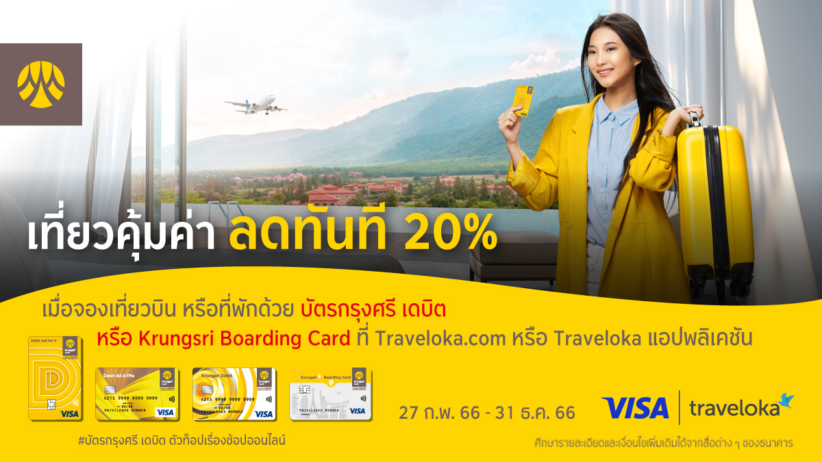 ผู้ที่สนใจสามารถดูรายละเอียดเพิ่มเติมได้ที่ https://www.krungsri.com/th/promotions/cards/travel/traveloka-discount-20-percent