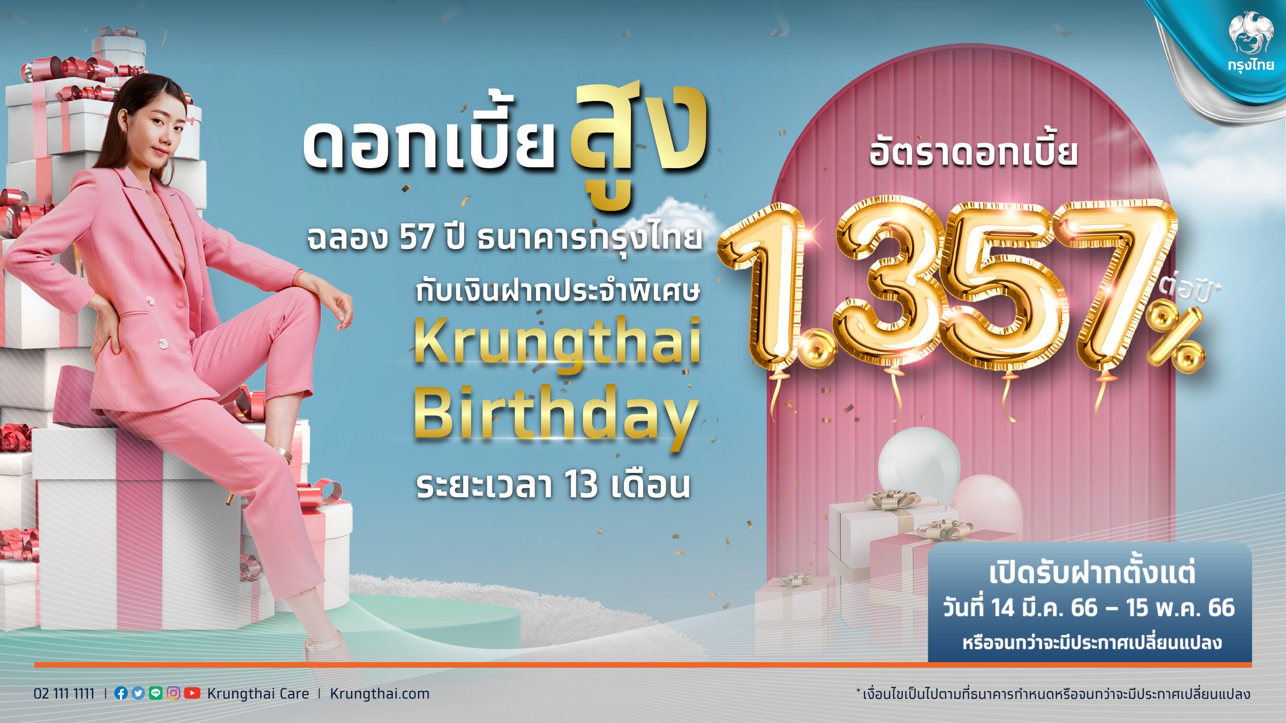 ธนาคารกรุงไทย ในฐานะธนาคารพาณิชย์ชั้นนำของประเทศ เดินหน้าพัฒนาผลิตภัณฑ์การเงินและการลงทุน ตอบโจทย์ความต้องการของลูกค้าทุกกลุ่มในทุกมิติ ยกระดับคุณภาพชีวิตคนไทยให้ดีขึ้นอย่างมั่นคงและยั่งยืน ล่าสุด ออกผลิตภัณฑ์เงินฝากประจำพิเศษตัวใหม่ “Krungthai Birthday ระยะเวลา 13 เดือน” อัตราดอกเบี้ย 1.357%ต่อปี เนื่องในโอกาสครบรอบ 57 ปี ธนาคารกรุงไทย “มุ่งสร้างคุณค่า สู่ความยั่งยืน” เพื่อตอบแทนลูกค้าผู้ฝากเงินให้มีรายได้เพิ่มขึ้น สนับสนุนให้คนไทยมีวินัยในการออม เสริมสร้างความมั่นคงทางการเงินในอนาคต
