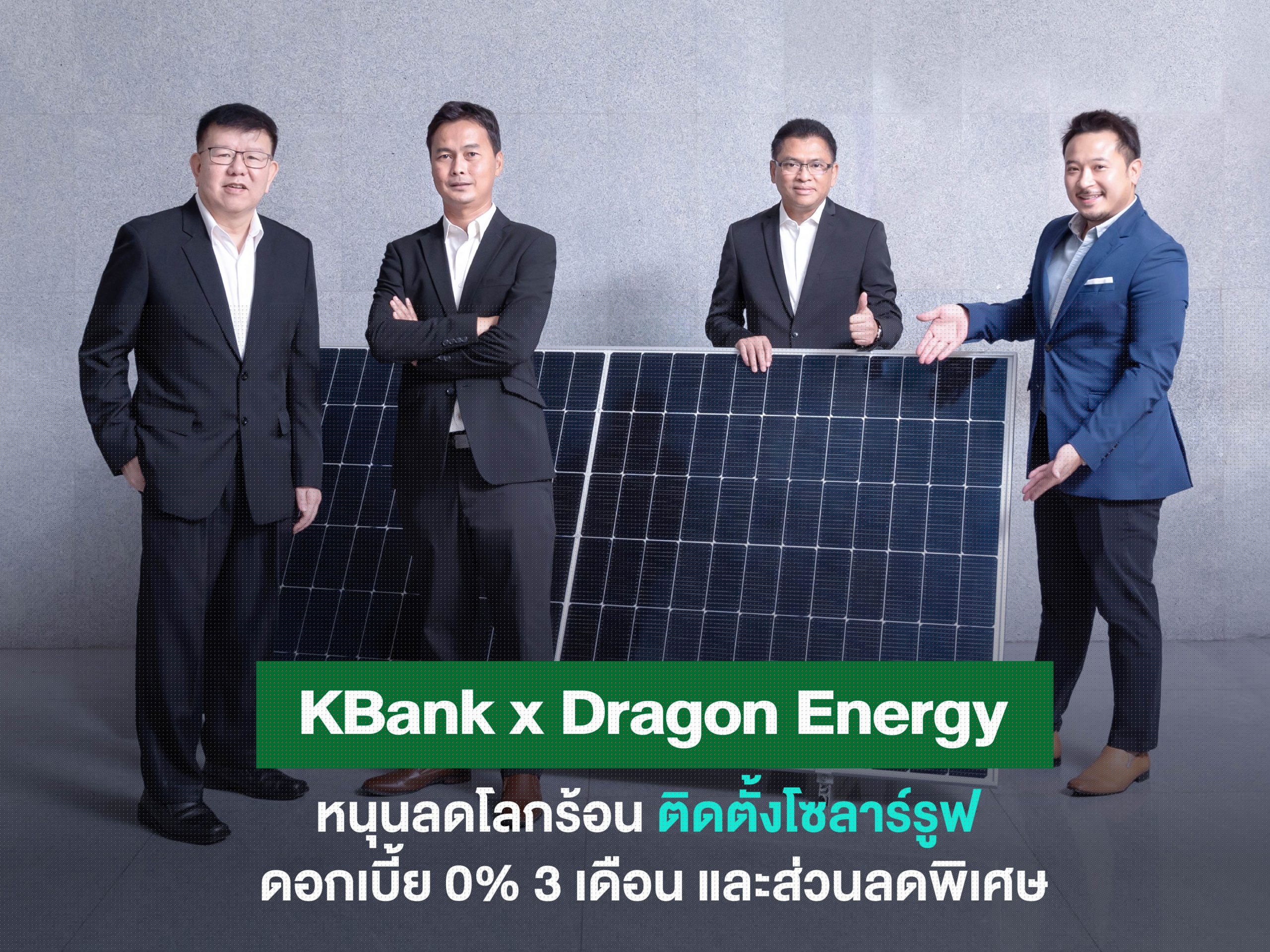 นายชัยยศ ตันพิสุทธิ์ ผู้ช่วยกรรมการผู้จัดการ และนายอลงกต บุญมาสุข ผู้อำนวยการอาวุโส ฝ่ายบริหารผลิตภัณฑ์และการตลาดสินเชื่อที่อยู่อาศัยและสินเชื่อบุคคลแบบมีหลักประกัน ธนาคารกสิกรไทย ร่วมกับนายพลกฤต กล่ำเครือ กรรมการผู้จัดการ และนายบรมวุฒิ หิรัญยัษฐิติ หุ้นส่วนบริหาร บริษัท ดราก้อนเอ็นเนอร์จี เทคโนโลยีแอนด์ ออแกไนท์เซอร์ จำกัด เปิดตัวแคมเปญ “สินเชื่อบ้าน Green Zero” มอบสิทธิพิเศษสำหรับผู้สนใจติดตั้งแผงโซลาร์กับ ดราก้อนเอ็นเนอร์จีฯ ชวนคนไทยใช้ชีวิตกรีน ภายใต้โครงการ GO GREEN Together ของธนาคาร โดยมีโปรโมชันและส่วนลดพิเศษ ดังนี้