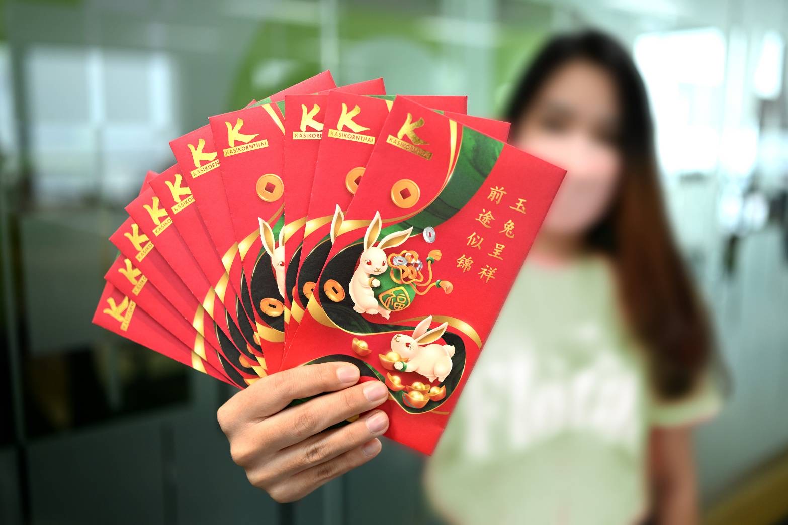 ธนาคารกสิกรไทย ต้อนรับเทศกาลตรุษจีน 2566 ปี “กระต่าย” จัดทำซองอั่งเปา “มั่ง มี ศรี สุข” รูปกระต่ายคู่บนทางหยก (Couple Rabbit on the Jade Way) ถือเป็นการอวยพรผู้ที่ได้รับซอง ให้ปีเถาะนี้ มีความก้าวหน้า สู่ความมั่งคั่ง ร่ำรวย อย่างราบรื่นแบบทวีคูณ โดยผลิตจำนวน 2,500,000 ซอง มอบให้แก่ลูกค้าสำหรับนำไปใส่ธนบัตรเพื่อแจกจ่ายช่วงเทศกาลตรุษจีน สามารถติดต่อรับได้ที่ธนาคารกสิกรไทยทุกสาขาทั่วประเทศ ตั้งแต่วันนี้เป็นต้นไป