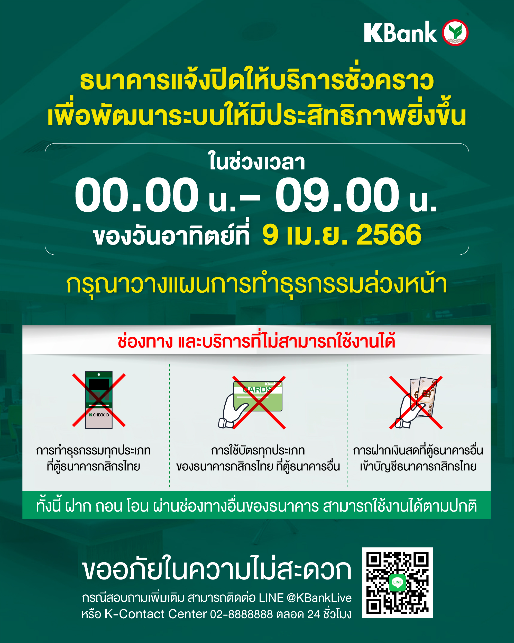 ธนาคารกสิกรไทยแจ้งจะปิดให้บริการชั่วคราว เพื่อพัฒนาระบบให้มีประสิทธิภาพยิ่งขึ้น ในวันอาทิตย์ที่ 9 เมษายน 2566 ช่วง เวลา 00:00 – 09:00 น. ส่งผลให้ลูกค้าไม่สามารถทำธุรกรรม ดังนี้