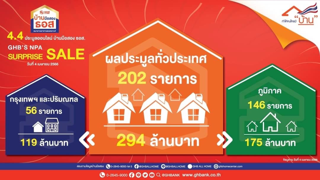 ธนาคารอาคารสงเคราะห์ (ธอส.) รายงานผลการประมูลบ้านมือสองออนไลน์ “4.4 GHB’S NPA Surprise Sale” ผ่าน Application : GHB ALL HOME ที่จัดขึ้นวันนี้ (4 เมษายน 2566) ระหว่างเวลา 12.00-13.00 น. สามารถจำหน่ายทรัพย์ NPAได้เป็นจำนวนทั้งสิ้น 202 รายการ คิดเป็นมูลค่าที่จำหน่ายได้รวม 294 ล้านบาท แบ่งเป็นทรัพย์ที่ตั้งอยู่ในพื้นที่กรุงเทพฯ และปริมณฑล จำนวน 56 รายการ คิดเป็นมูลค่า 119 ล้านบาท และทรัพย์