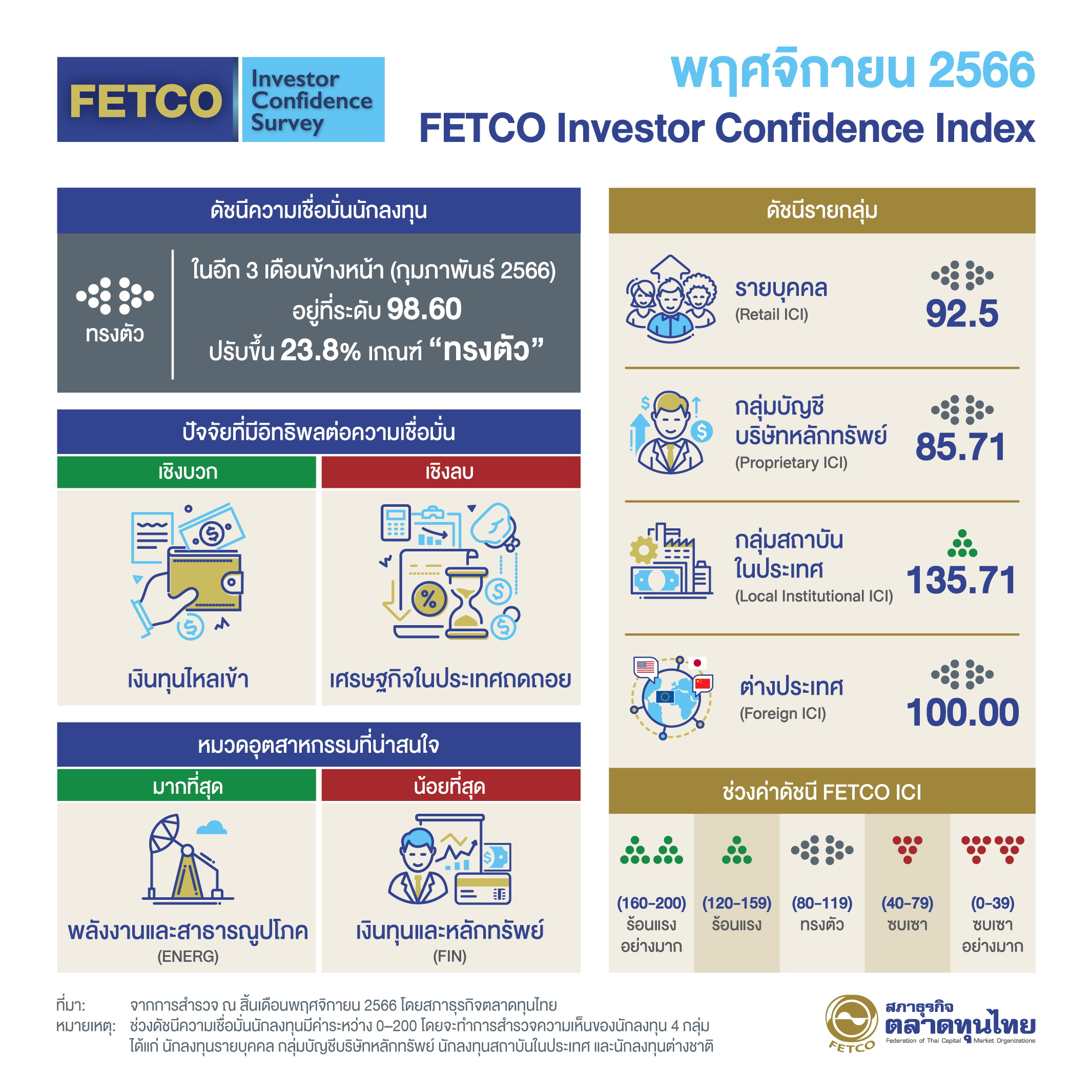 นายกอบศักดิ์ ภูตระกูล ประธานกรรมการสภาธุรกิจตลาดทุนไทย เปิดเผยดัชนีความเชื่อมั่นนักลงทุน (FETCO Investor Confidence Index) ผลสำรวจในเดือนพฤศจิกายน 2566 (สำรวจระหว่างวันที่ 20–30 พฤศจิกายน 2566) พบว่า “ดัชนีความเชื่อมั่นนักลงทุน (FETCO Investor Confidence Index: ICI) ในอีก 3 เดือนข้างหน้าอยู่ที่ระดับ 98.60 ปรับขึ้น 23.8% จากเดือนก่อนหน้าลงมาอยู่ในเกณฑ์ “ทรงตัว” โดยนักลงทุนมองว่าการไหลเข้าของเงินทุน เป็นปัจจัยหนุนความเชื่อมั่นมากที่สุด รองลงมาคือนโยบายการเงินของ FED ในการหยุดขึ้นอัตราดอกเบี้ย และ มาตรการกระตุ้นเศรษฐกิจของภาครัฐ ในขณะที่ปัจจัยที่ฉุดความเชื่อมั่นนักลงทุนมากที่สุด ได้แก่ การถดถอยของเศรษฐกิจในประเทศ รองลงมาคือสถานการณ์ความขัดแย้งระหว่างประเทศ และสถานการณ์เศรษฐกิจจีน