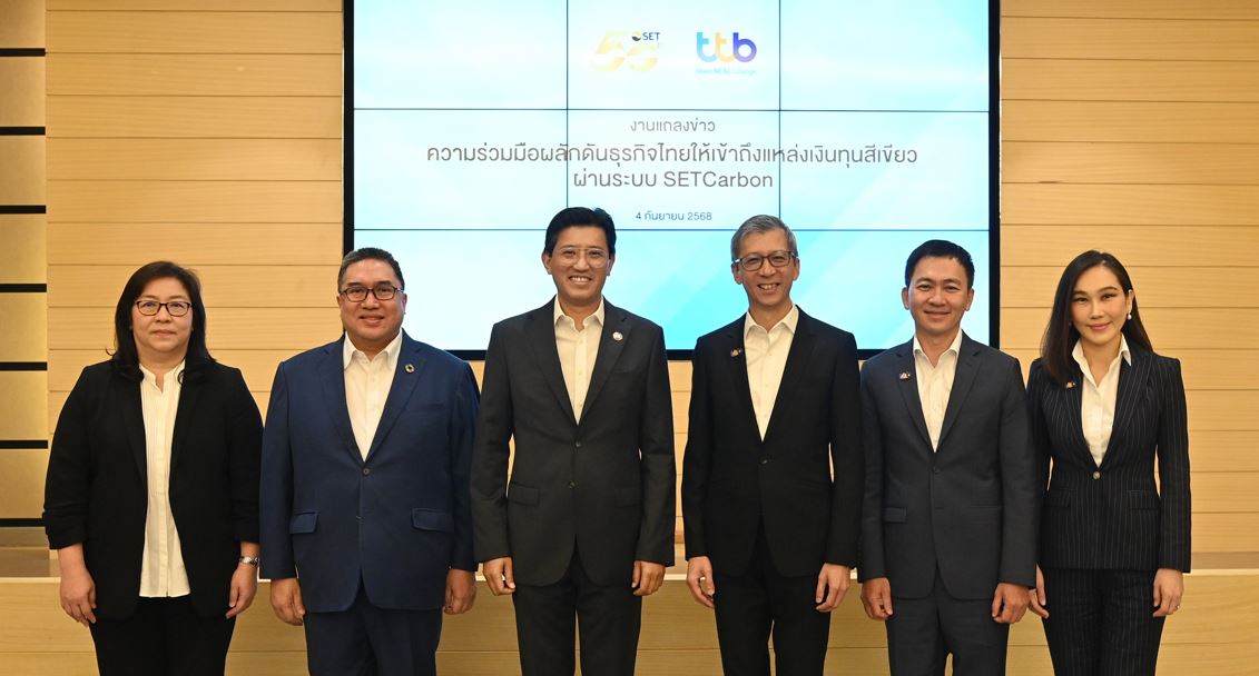ตลาดหลักทรัพย์แห่งประเทศไทย และ ทีเอ็มบีธนชาต หรือ ทีทีบี ผนึกกำลังเพื่อขยายระบบนิเวศการเงินเพื่อความยั่งยืน (Sustainable Finance) มุ่งสนับสนุนธุรกิจไทยให้เข้าถึงแหล่งเงินทุนสีเขียว ด้วยการใช้ข้อมูล ESG พิจารณาสินเชื่อ และส่งเสริมให้ลูกค้าธนาคารมีระบบช่วยจัดการ คำนวณ และรายงานข้อมูลการปล่อยก๊าซเรือนกระจกอย่างมีประสิทธิภาพผ่านระบบ SETCarbon ซึ่งจะทำหน้าที่เป็น “พาสปอร์ต” ให้ธุรกิจทุกขนาดสามารถเข้าถึงสินเชื่อที่มีสิทธิประโยชน์มากกว่าสินเชื่อทั่วไป ความตั้งใจร่วมกันของตลาดหลักทรัพย์ฯ และ ทีทีบี จะเป็นส่วนหนึ่งที่ผลักดันให้ภาคธุรกิจบรรลุเป้าหมายด้านความยั่งยืน และเติบโตไปพร้อมกับการสร้างระบบการเงินที่ยั่งยืน