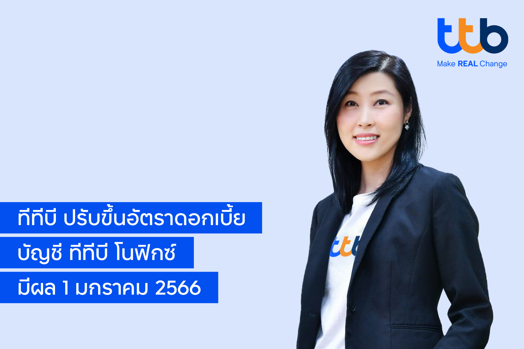 ทีเอ็มบีธนชาต หรือ ทีทีบี ประกาศปรับขึ้นอัตราดอกเบี้ยเงินฝาก บัญชีทีทีบี โนฟิกซ์ เป็น 1.10% เพื่อส่งเสริมวินัยการออมให้คนไทย และรับผลตอบแทนดอกเบี้ยในช่วงทิศทางขาขึ้น นำไปใช้จ่ายในชีวิตประจำวัน มีผลตั้งแต่วันที่ 1 มกราคม 2566 เพื่อเป็นของขวัญปีใหม่