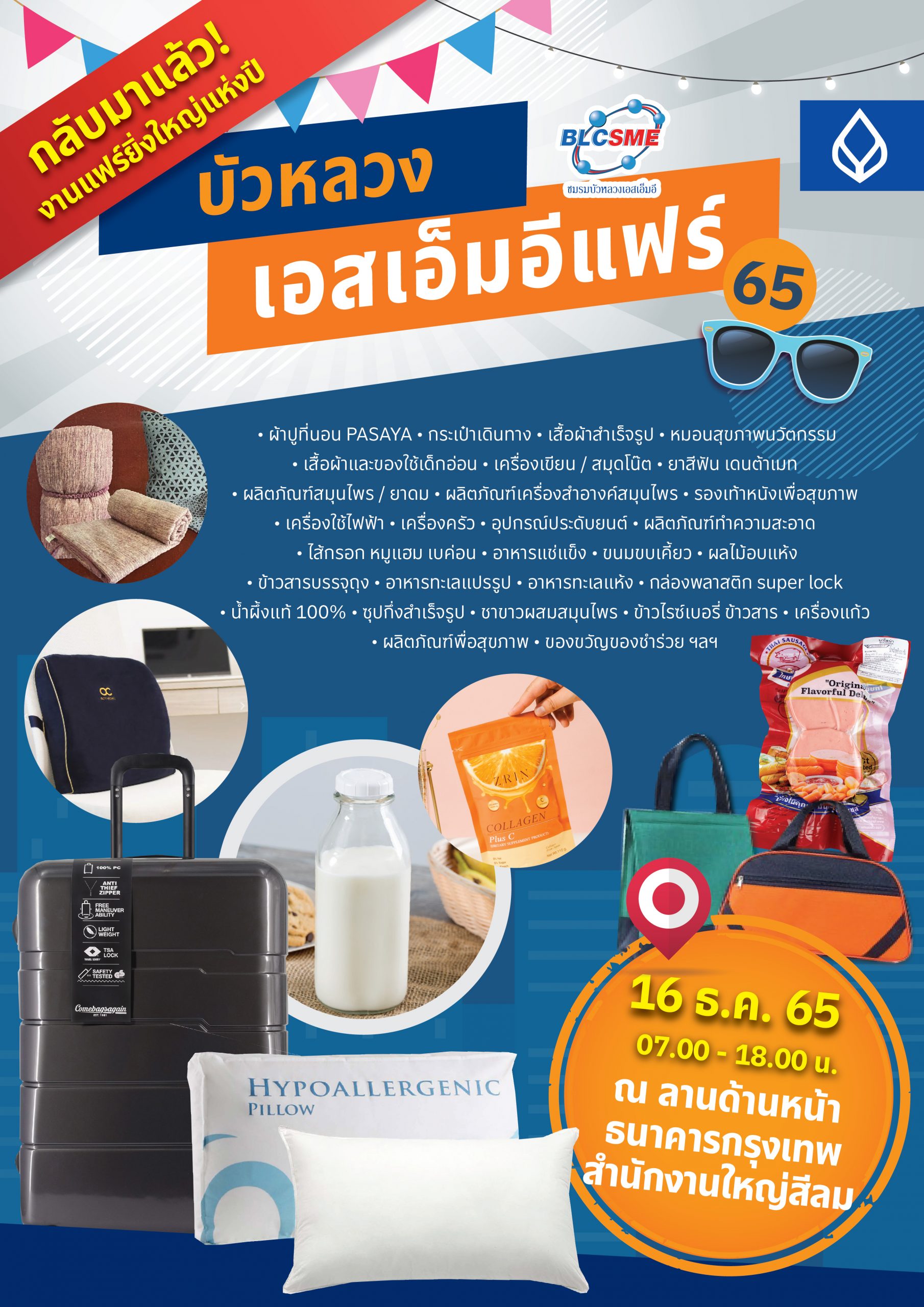 ธนาคารกรุงเทพ จำกัด (มหาชน) นำโดย นายเดชา ตุลานันท์ ประธานกรรมการบริหาร ร่วมกับ ชมรมบัวหลวงเอสเอ็มอี ขอเชิญเลือกชม ชิม อปสินค้าอุปโภคบริโภคคุณภาพเยี่ยม ราคาพิเศษ จากโรงงานผู้ประกอบการสมาชิกชมรมบัวหลวงเอสเอ็มอี ในงาน บัวหลวงเอสเอ็มอีแฟร์ 2565 ครั้งที่ 13 งานแฟร์ประจำปีที่จัดขึ้นอย่างต่อเนื่อง เพื่อสนับสนุนผู้ประกอบการ SME ได้จำหน่ายสินค้าคุณภาพแบบส่งตรงถึงมือผู้บริโภค