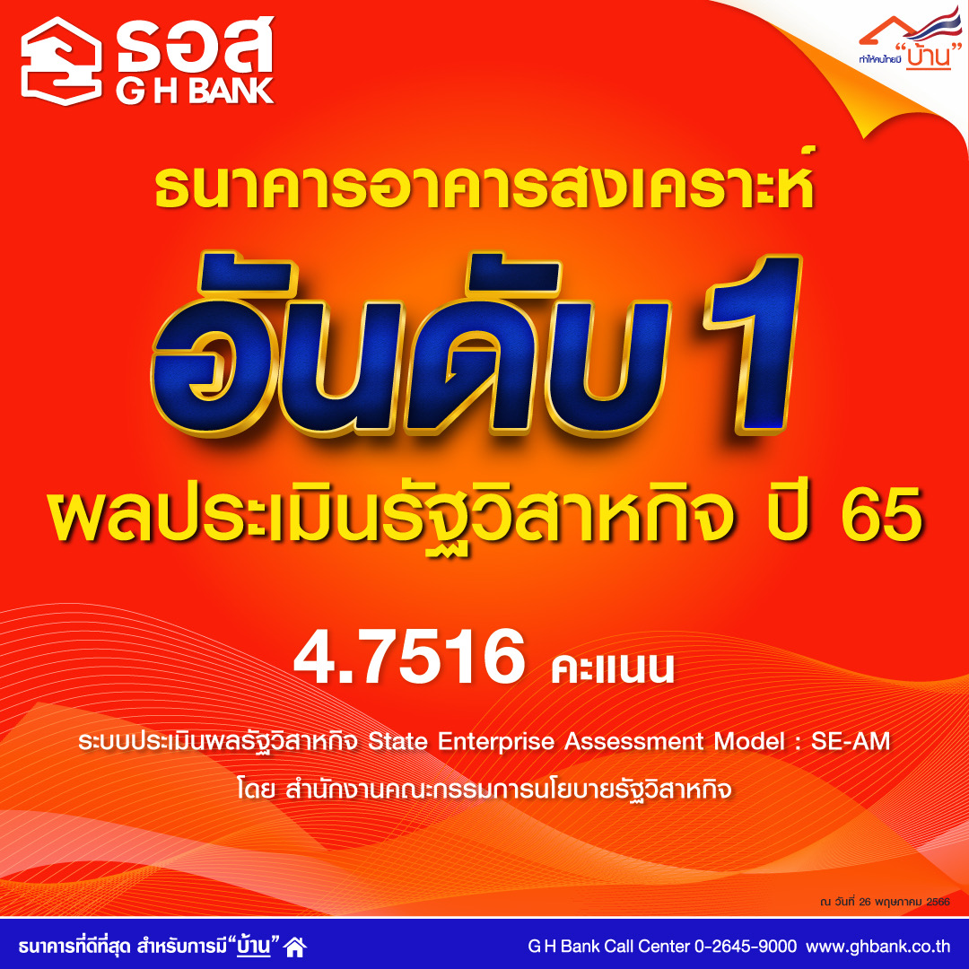 ทั้งนี้ การที่ธนาคารได้รับคะแนนผลประเมินผลการดำเนินงานรัฐวิสาหกิจ ประจำปี 2565 สูงที่สุดเป็นอันดับ 1 ด้วยคะแนนรวม 4.7516 สูงสุดในการประเมินผลการดำเนินงานรัฐวิสาหกิจ ทั้ง 51 แห่ง เป็นผลมาจากการร่วมมือกันของผู้บริหาร พนักงานทุกคนภายในองค์กรที่มุ่งมั่น ตั้งใจขับเคลื่อนองค์กรให้สัมฤทธิ์ผลตามพันธกิจ “ทำให้คนไทยมีบ้าน” และยังคงพร้อมดำเนินงานเพื่อให้องค์กรบรรลุวิสัยทัศน์ “ธนาคารที่ดีที่สุดสำหรับการมีบ้าน” ต่อไป