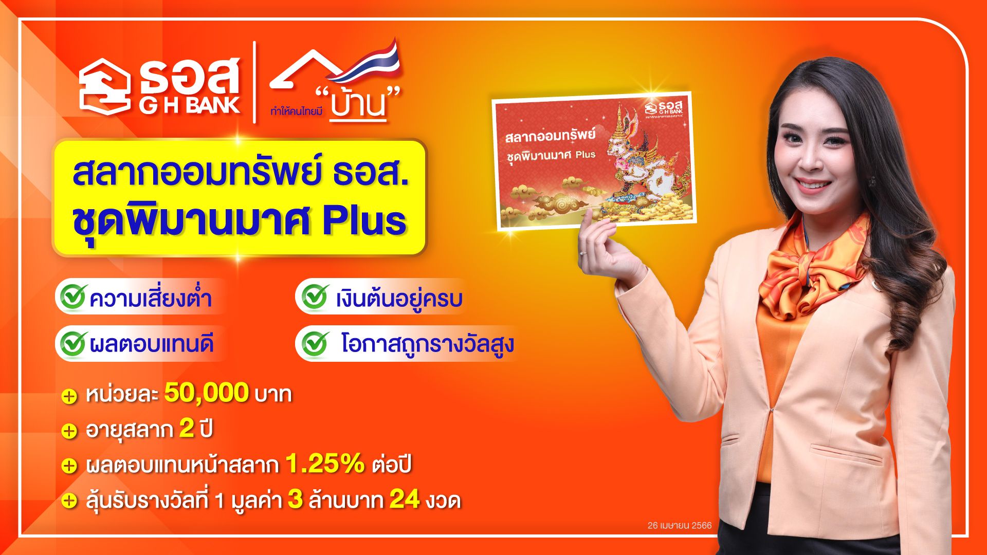ธนาคารอาคารสงเคราะห์ (ธอส.) ตอบแทนลูกค้าและเพิ่มทางเลือกให้กับผู้ที่รักการออม ด้วยผลิตภัณฑ์สลากออมทรัพย์ ที่ให้ผลตอบแทนสูงและมีความเสี่ยงต่ำ กับ สลากออมทรัพย์ ธอส. ชุดพิมานมาศ Plus มูลค่าหน่วยละ 50,000 บาท อายุสลาก 2 ปี ผลตอบแทน 1.25% ต่อปี เมื่อฝากครบกำหนดจะได้รับเงินต้นพร้อมดอกเบี้ยรวมหน่วยละ 51,250 บาท