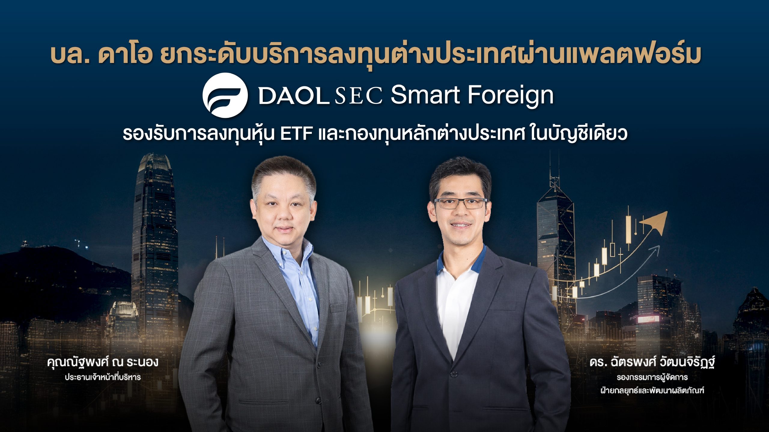 บริษัทหลักทรัพย์ ดาโอ (ประเทศไทย) จำกัด (มหาชน) หรือ บล. ดาโอ เดินหน้าขยายโอกาสการลงทุนต่างประเทศ ผ่านแพลตฟอร์ม DAOLSEC Smart Foreign ด้วยจุดเด่น “เปิดบัญชีครั้งเดียว ลงทุนได้ครบ” ครอบคลุมทั้งหุ้นต่างประเทศ ETF และการลงทุนตรงในกองทุนหลักต่างประเทศ (Master Funds) จากบริษัทจัดการกองทุนชั้นนำทั่วโลก ผ่านระบบออนไลน์ในแพลตฟอร์มเดียว ช่วยเพิ่มทางเลือกในการเข้าถึงสินทรัพย์คุณภาพและธีมการลงทุนระดับเมกะเทรนด์ พร้อมสนับสนุนการกระจายความเสี่ยงของพอร์ตอย่างมีประสิทธิภาพ