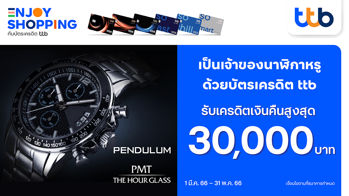 บัตรเครดิต ttb ร่วมกับนาฬิกาแบรนด์หรู PENDULUM และ PMT The Hour Glass มอบเครดิตเงินคืนสูงสุด 30,000 บาท เมื่อช้อปนาฬิกาหรู ที่ร้าน PENDULUM เซ็นทรัลเวิลด์ สยามพารากอน และเชียงใหม่ ร้าน Frank Muller สยามพารากอน ร้าน Breitling สยามพารากอน และสยาม พรีเมี่ยม เอาท์เล็ต และร้าน PMT The Hour Glass สยามพารากอน ไอคอนสยาม เซ็นทรัลเอมบาสซี เกษรวิลเลจ เอมควอเทียร์ และเซ็นทรัล ภูเก็ต ฟลอเรสตา โดยชำระเงินเต็มจำนวน ระหว่างวันที่ 1 มีนาคม 2566 – 31 พฤษภาคม 2566 โดยมีรายละเอียดดังนี้