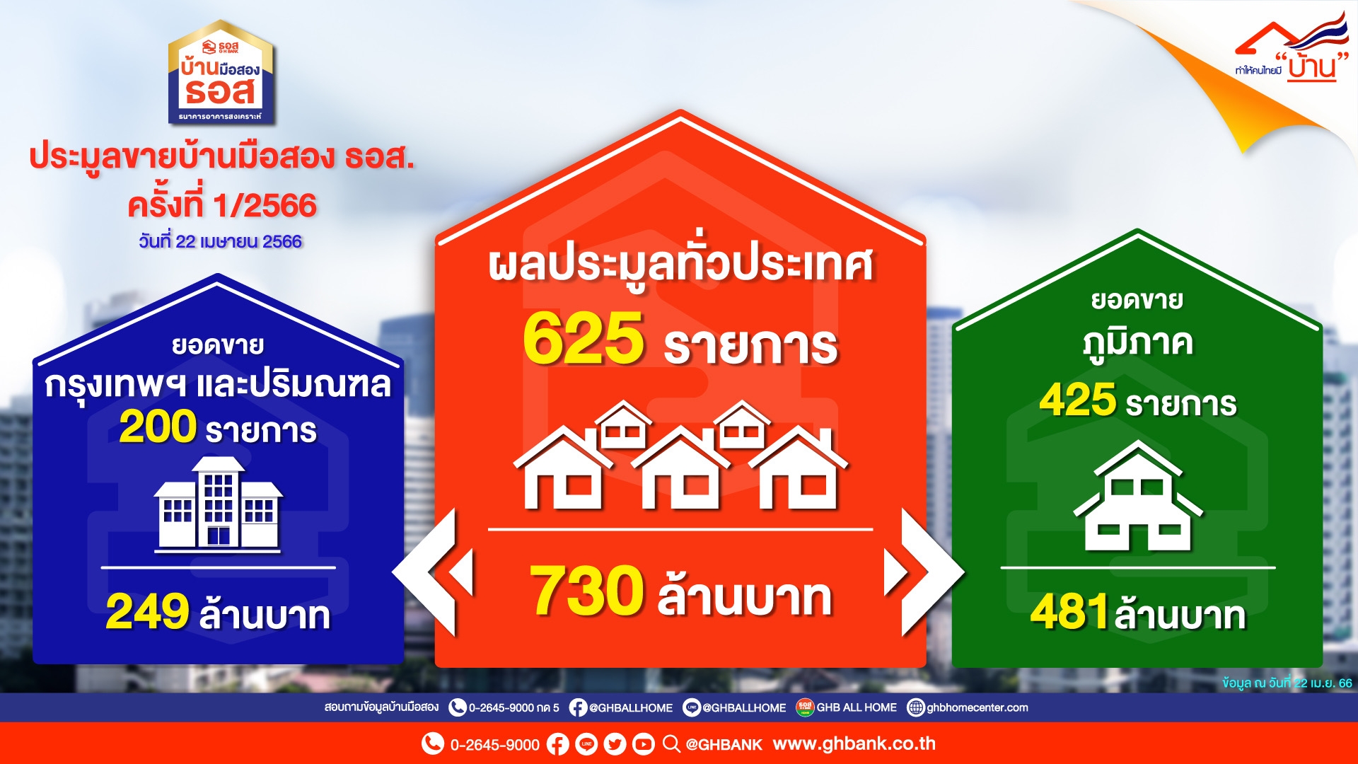 สำหรับผู้ที่พลาดการประมูลในครั้งนี้ สามารถร่วมประมูลครั้งต่อไปได้ในวันที่ 19 พฤษภาคม 2566 ในงานประมูลบ้านมือสอง ธอส. ออนไลน์ GHB Online Auctionสอบถามข้อมูลเพิ่มเติมได้ที่ G H Bank Call Center โทร. 0-2645-9000 กด 5 หรือ Facebook Fanpage ธนาคารอาคารสงเคราะห์ หรือ ดูข้อมูลบ้านมือสอง ธอส. ได้ที่ www.ghbhomecenter.com, Mobile Application : GHB ALL HOME และ Line Official Account :@GHBALLHOME