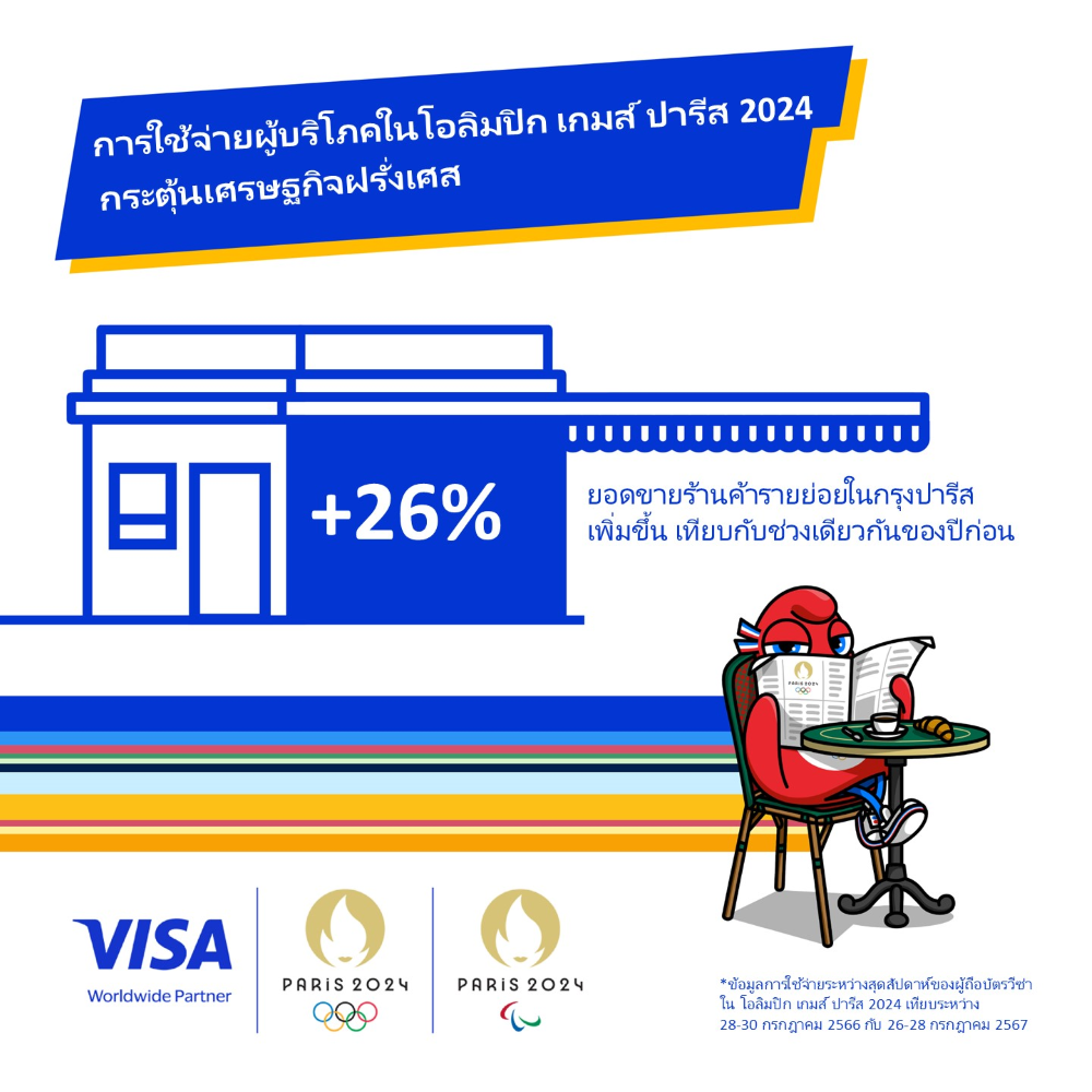 - ธุรกิจขนาดเล็ก และร้านค้ารายย่อยในกรุงปารีสมียอดขายเพิ่มขึ้นถึง 26% จากผู้ถือบัตรวีซ่าในช่วงสุดสัปดาห์แรกของมหกรรมกีฬาโอลิมปิก