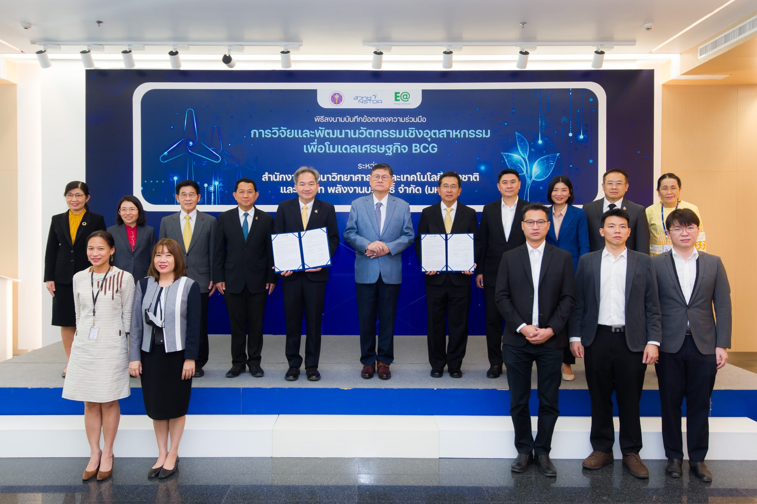 ศาสตราจารย์ ดร.ชูกิจ ลิมปิจำนงค์ ผู้อำนวยการสำนักงานพัฒนาวิทยาศาสตร์และเทคโนโลยีแห่งชาติ (สวทช.) และนายสมโภชน์ อาหุนัย ประธานเจ้าหน้าที่บริหาร บริษัท พลังงานบริสุทธิ์ จำกัด (มหาชน) หรือ EA ร่วมลงนามบันทึกข้อตกลงความร่วมมือการวิจัยและพัฒนาเพื่อนวัตกรรมเชิงอุตสาหกรรมเพื่อ Bio-Circular-Green Economy