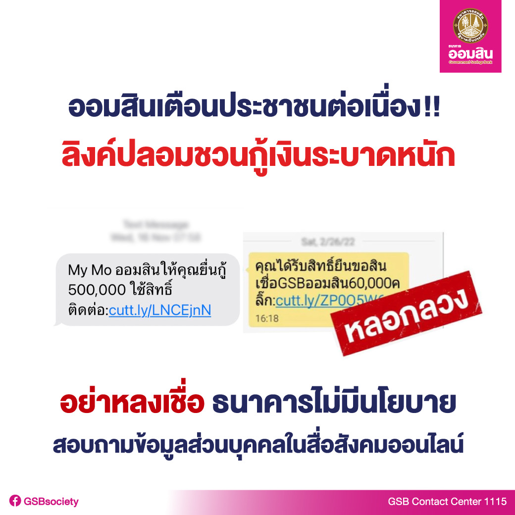 รายงานข่าวจากธนาคารออมสิน แจ้งว่า ขณะนี้ได้มีกลุ่มมิจฉาชีพแอบอ้างใช้ชื่อ “สินเชื่อGSBออมสิน” “My Mo ออมสิน” ตลอดทั้งใช้โลโก้ธนาคาร ส่งข้อความในรูปแบบลิงก์ SMS Line หรือ Facebook เข้ามือถือของลูกค้าและประชาชนจำนวนมาก โดยใช้ข้อความเชิญชวนลักษณะกระตุ้นให้กดรับสิทธิหรือกดลิงก์เข้าไป ทั้งนี้ ลิงก์ข้อความดังกล่าวไม่ใช่ของธนาคารออมสิน ขอให้ลูกค้าและประชาชนอย่าหลงเชื่อ ไม่กดลิงก์ และไม่เพิ่มเพื่อน หรือกรอกข้อความใดๆ เด็ดขาด เพิ่มความระมัดระวังมากยิ่งขึ้น