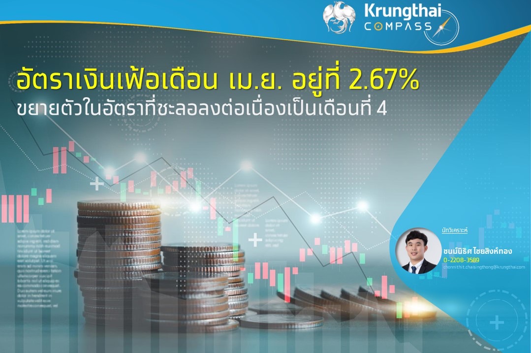 อัตราเงินเฟ้อทั่วไปเดือน เม.ย. ขยายตัว 2.67%YoY ชะลอลงจากเดือนก่อนที่ขยายตัว 2.83%YoY ใกล้เคียงกับนักวิเคราะห์คาดไว้ที่ 2.7% โดยขยายตัวชะลอลงต่อเนื่องเป็นเดือนที่ 4 จากราคาหมวดอาหารสดที่ขยายตัว 5.50%YoY ชะลอลงจากเดือน มี.ค. ที่ 6.66%YoY ตามราคากลุ่มเนื้อสัตว์ เป็ดไก่ และสัตว์น้ำ ที่ลดลงและฐานราคาที่สูงในปีก่อนหน้า ขณะที่หมวดพลังงานขยายตัว 3.30%YoY เร่งขึ้นเทียบกับเดือนก่อนที่ 2.42%YoY ตามราคาน้ำมันขายปลีก