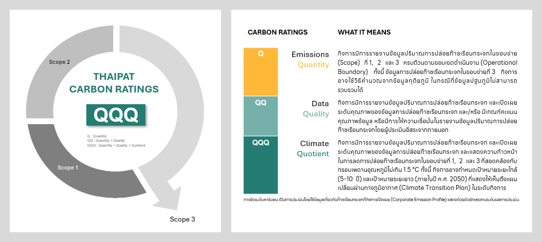 ด้วยประสบการณ์กว่า 11 ปี ของสถาบันไทยพัฒน์ในการประเมินข้อมูลด้าน ESG ของกิจการ จึงได้ขยายผลมาสู่การประเมินข้อมูลบัญชีคาร์บอนของภาคธุรกิจ เพื่อการจัดระดับบริษัทจดทะเบียนด้านความสามารถทางภูมิอากาศ ในรูปแบบของ Carbon Ratings เป็นครั้งแรกในประเทศไทย