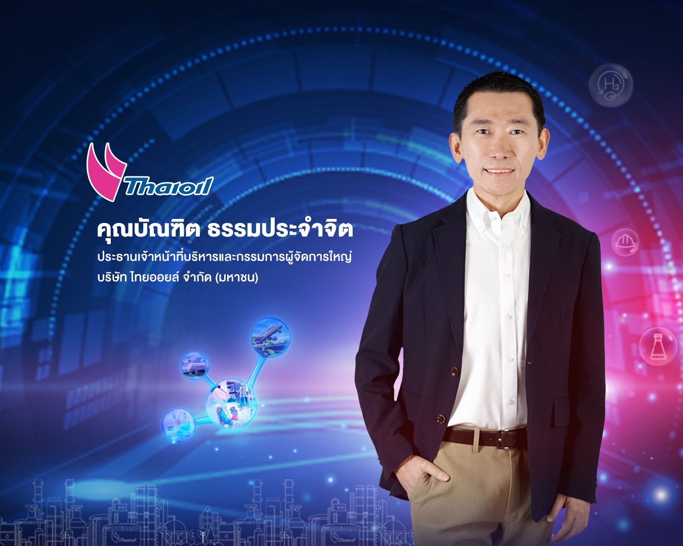 นายบัณฑิต ธรรมประจำจิต ประธานเจ้าหน้าที่บริหารและกรรมการผู้จัดการใหญ่ บริษัท ไทยออยล์ จำกัด (มหาชน) ได้เข้ารับตำแหน่ง CEO เมื่อเดือนมกราคมที่ผ่านมา กล่าวว่า “ตนรู้สึกเป็นเกียรติและภาคภูมิใจเป็นอย่างยิ่งกับบทบาทใหม่ในบ้านหลังเดิม โดยภารกิจสำคัญที่ต้องดำเนินการ คือ สานต่อการทรานส์ฟอร์มธุรกิจกลุ่มไทยออยล์ตามเส้นทางยุทธศาสตร์หลัก 3V คือ 1) Value Maximization ต่อยอดจากธุรกิจปิโตรเลียมไปสู่ธุรกิจปิโตรเคมีและผลิตภัณฑ์มูลค่าสูง (High Value Products) 2) Value Enhancement เสริมความแข็งแกร่งในประเทศ ขยายตลาดและกระจายผลิตภัณฑ์ไปสู่ต่างประเทศในระดับภูมิภาค รองรับการเติบโตของธุรกิจกลุ่มไทยออยล์ ในอนาคต รวมทั้งตอบสนองต่อความต้องการของผู้บริโภคให้มากยิ่งขึ้น และ 3) Value Diversification ลงทุนในธุรกิจใหม่ๆ โดยเฉพาะธุรกิจที่มีมูลค่าสูง (High Value Business) และ ธุรกิจ New S-Curve อื่นๆ ให้สอดคล้องต่อแนวโน้มการเปลี่ยนแปลงของโลก