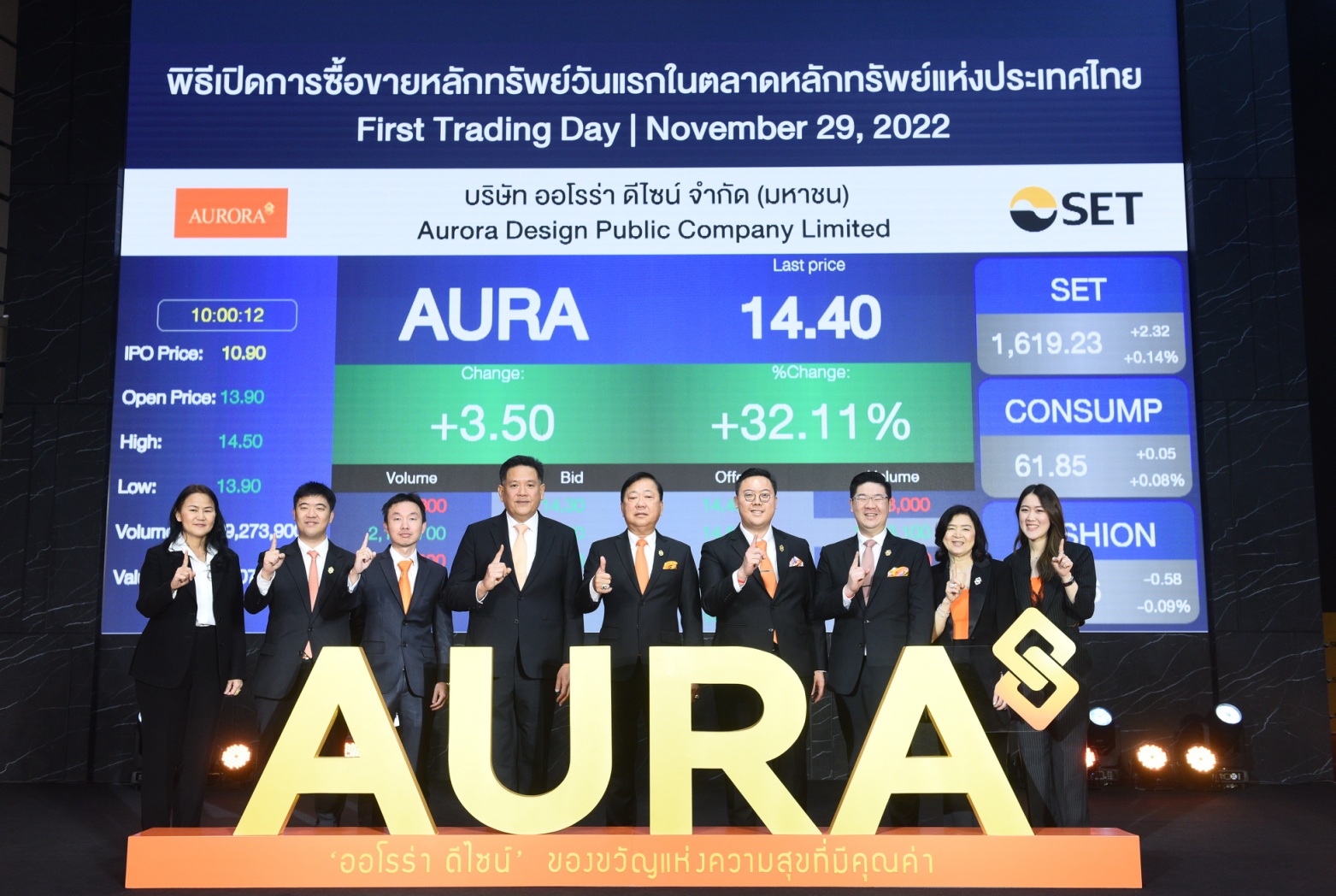 นายอนิวรรต ศรีรุ่งธรรม ประธานเจ้าหน้าที่บริหาร บริษัท ออโรร่า ดีไซน์ จำกัด (มหาชน) ) “บริษัทฯ”)หรือ AURA เปิดเผยว่า บริษัทฯ ได้นำหุ้นเข้าซื้อขายวันแรกในตลาดหลักทรัพย์แห่งประเทศไทย ในวันที่ 29 พฤศจิกายน 2565 โดยใช้ชื่อย่อว่า ‘AURA’ เชื่อมั่นว่าด้วยศักยภาพของบริษัทฯ ที่มีพื้นฐานการดำเนินธุรกิจที่แข็งแกร่งและมีโอกาสสร้างการเติบโตที่ดี จะทำให้ AURA เป็นหุ้นที่ได้รับความสนใจจากนักลงทุน จากแผนธุรกิจมุ่งสู่การเป็นผู้นำร้านทองของประเทศไทย ส่งมอบของขวัญแห่งความสุขที่มีคุณค่าครบวงจร โดยตั้งเป้าหมายสร้างรายได้และกำไรที่เติบโตอย่างยั่งยืน