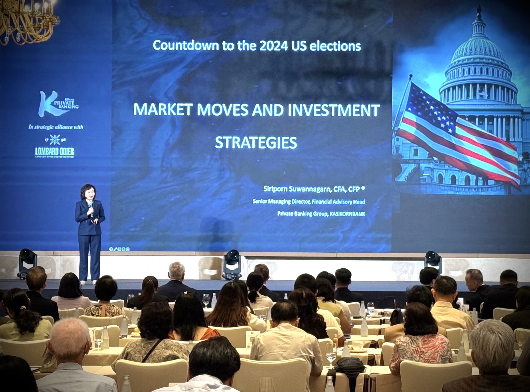 KBank Private Banking ร่วมกับ Lombard Odier และ J.P. Morgan Asset Management (JPMAM) จัดงานสัมมนาในหัวข้อ Countdown To The Us Elections: Market Moves And Investment Strategies เพื่อวิเคราะห์สถานการณ์โค้งสุดท้ายการเลือกตั้งประธานาธิบดีสหรัฐอเมริกาที่กำลังจะเกิดขึ้น ถือเป็นการเลือกตั้งที่น่าจับตามองมากที่สุด ด้วยสถานการณ์ในปัจจุบันที่ผลโพลและคะแนนนิยมค่อนข้างสูสีกัน ประกอบกับเศรษฐกิจโลกที่กำลังชะลอตัว และอยู่ในวัฏจักรดอกเบี้ยขาลง บวกกับการแบ่งขั้วทางการเมือง รวมถึงความขัดแย้งระหว่างประเทศที่มีการเผชิญหน้าอย่างชัดเจนและรุนแรงมากขึ้น ที่ล้วนเป็นปัจจัยที่สร้างความกังวลให้กับนักลงทุน อย่างไรก็ดี ไม่ว่าผลการเลือกตั้งจะออกมาอย่างไรก็จะส่งผลต่อการเปลี่ยนแปลงนโยบาย กระทบเศรษฐกิจ ธุรกิจ และการลงทุน ทั้งนี้ได้แนะให้นักลงทุนจัดพอร์ตแบบกระจายความเสี่ยง เพื่อรับมือกับความผันผวนระยะสั้นหลังการเลือกตั้ง