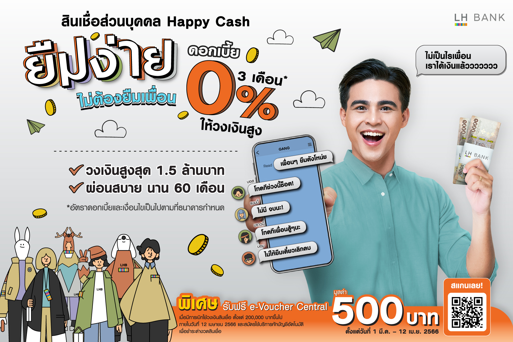 LH Bank ออกแคมเปญสินเชื่อบุคคล Happy Cash by LH Bank ชูดอกเบี้ยเริ่มต้น 0% นาน 3 เดือนแรก วงเงินกู้สูงสุด 5 เท่าของรายได้ หรือสูงสุด 1.5 ล้านบาท ผ่อนนานสูงสุด 60 เดือน ภายใต้คอนเซป “ยืมง่าย ไม่ต้องยืมเพื่อน” ตอบโจทย์พนักงานเงินเดือนที่มีรายได้ 15,000 บาทขึ้นไป และผู้ประกอบธุรกิจส่วนตัวที่มีรายได้ 50,000 บาทขึ้นไป พิเศษ! สำหรับลูกค้าที่เบิกใช้วงเงินสินเชื่อตั้งแต่ 200,000 บาทขึ้นไป และสมัครใช้บริการหักบัญชีอัตโนมัติเพื่อชำระค่างวดสินเชื่อ ตั้งแต่วันนี้ – 12 เมษายน 2566 รับฟรี e-Voucher Central มูลค่า 500 บาท