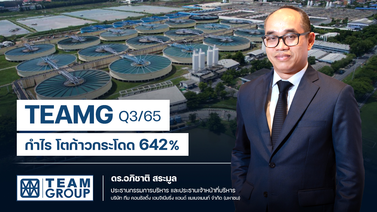ดร.อภิชาติ สระมูล ประธานกรรมการบริหาร และประธานเจ้าหน้าที่บริหาร บริษัท ทีม คอนซัลติ้ง เอนจิเนียริ่ง แอนด์ แมเนจเมนท์ จำกัด (มหาชน) หรือ TEAMG เปิดเผยว่า บริษัทมีรายได้รวมในไตรมาส 3/2565 (สิ้นสุดวันที่ 30 กันยายน 2565) รวมทั้งสิ้น 427.82 ล้านบาท เพิ่มขึ้นจากไตรมาส 2/2565 ที่มีรายได้รวมอยู่ที่ 349.36 ล้านบาท คิดเป็นอัตราที่เพิ่มขึ้น 22.5% และกำไรสุทธิ 41.94 ล้านบาท เมื่อเทียบกับไตรมาส 2/2565 ที่มีกำไรสุทธิ 5.65 ล้านบาท เพิ่มขึ้น 36.29 ล้านบาท หรือ 642.3%