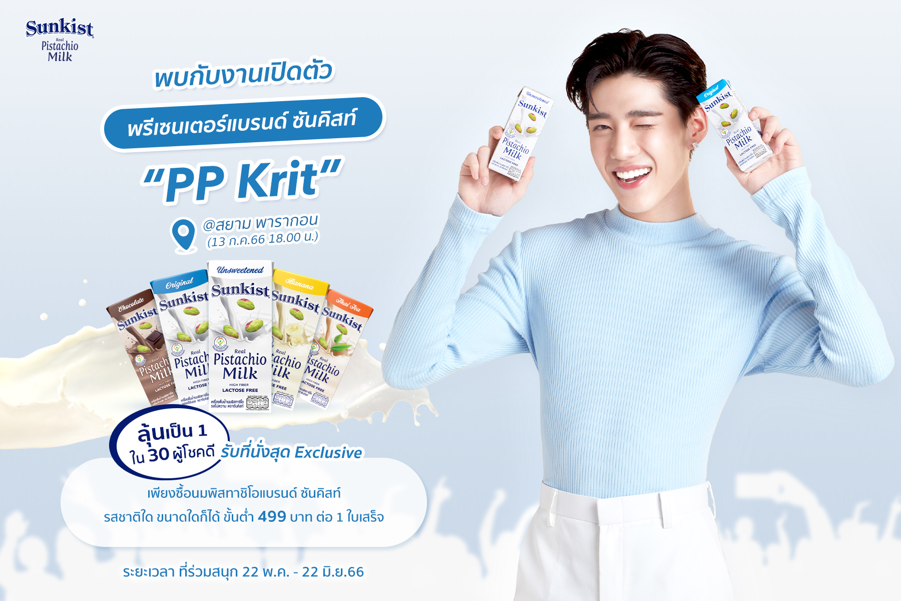 เซอร์ไพรส์สุดพิเศษจากซันคิสท์ แบรนด์ผลิตภัณฑ์ถั่วพิสทาชิโอ และเครื่องดื่มน้ำนมพิสทาชิโอ ภายใต้เครือเฮอริเทจ ชวนแฟนคลับร่วมลุ้นเป็นหนึ่งในผู้โชคดี 30 ท่าน ที่มีสิทธิเข้าร่วมงานเปิดตัวพรีเซนเตอร์คนใหม่ พีพี กฤษฏ์ อำนวยเดชกร พร้อมกิจกรรมสุดเอ็กซ์คลูซิฟ ณ สยามพารากอน โซน แฟชั่นฮอลล์  วันพฤหัสที่ 13 กรกฎาคม 2566 เวลา 18.00 น. เป็นต้นไป และรับสิทธิพิเศษอีกมากมายจากแบรนด์ซันคิสท์