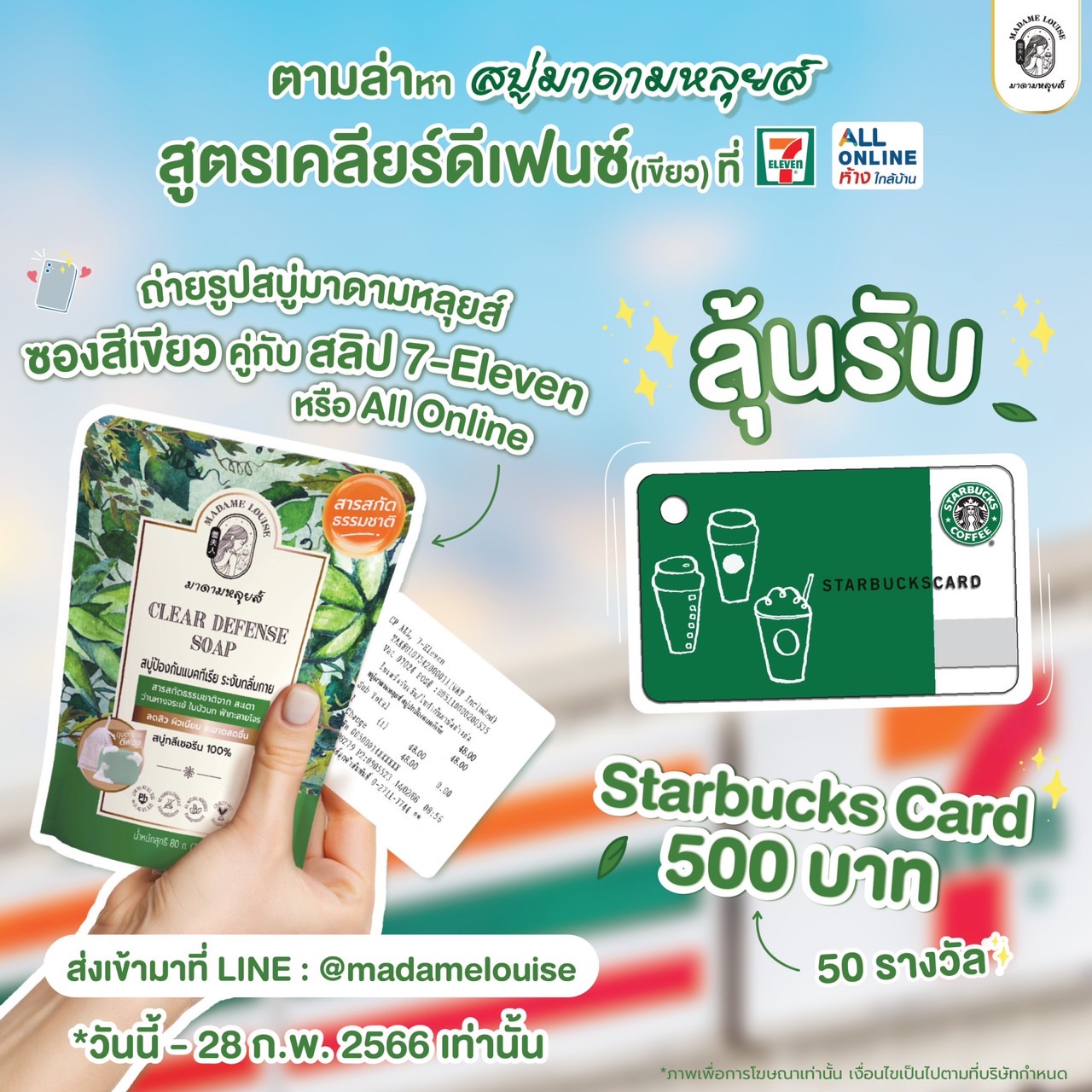 มาดามหลุยส์ แบรนด์สบู่สมุนไพรระดับพรีเมียม ในราคาเข้าถึงได้ จัดกิจกรรมสุดเอ็กซ์คลูซีฟ เมื่อซื้อสบู่มาดามหลุยส์สูตรเคลียร์ดีเฟนซ์ (ซองสีเขียว) ที่ 7-Eleven พร้อมถ่ายรูปสบู่มาดามหลุยส์คู่ใบเสร็จ หรือแคปหน้าจอ All Online แล้วส่งเข้ามาที่ LINE : @madamelouise เพื่อลุ้นรับบัตร Starbucks Card มูลค่า 500 บาท มากถึง 50 รางวัล