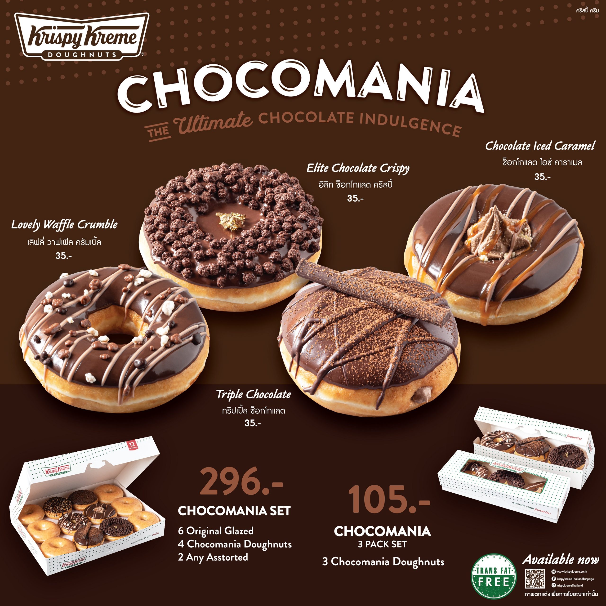 คริสปี้ ครีม (Krispy Kreme) โดนัทสูตรลิขสิทธิ์อันดับ 1 ที่ครองใจคนทั่วโลก มอบประสบการณ์แสนพิเศษ “คริสปี้ ครีม ช็อกโกแมเนีย” (Krispy Kreme Chocomania) ให้ดื่มด่ำกับรสชาติชวนหลงใหลของช็อกโกแลตพรีเมียมที่จับคู่อย่างลงตัวกับโดนัทเนื้อนุ่มสูตรลิขสิทธิ์ รังสรรค์เป็นความอร่อย 4 สไตล์ เริ่มด้วย “อิลิท ช็อกโกแลต คริสปี้” (Elite Chocolate Crispy) โดนัทเคลือบช็อกโกแลตเกลซเข้มข้นเติมความกรุบกรอบด้วยช็อกโกแลตไรซ์คริสปี้ พร้อมแผ่นทองสุดหรู ต่อด้วยโดนัทฟิลริงยอดฮิต “เลิฟลี่ วาฟเฟิล ครัมเบิ้ล” (Lovely Waffle Crumble) อินเลิฟไปกับไส้มอคค่าวิปครีมเต็มวง พร้อมโรยวาฟเฟิลครัมเบิ้ล หรือจะจัดเต็มกับความหอมอร่อยของช็อกโกแลต, คาราเมล และช็อกโกวิปครีมบนโดนัทออริจินัลกับ “ช็อกโกแลต ไอซ์ คาราเมล” (Chocolate Iced Caramel) และปิดท้ายด้วย “ทริปเปิ้ล ช็อกโกแลต” (Triple Chocolate) ความอร่อยที่เพิ่มเลเวลให้สาวกช็อกโกแลตได้เข้มเต็มรสกับดาร์กช็อกโกแลตด้านบน พร้อมสอดไส้ช็อกโกวิปครีมแบบเน้นๆ ในราคาเพียงชิ้นละ 35 บาท เท่านั้น
