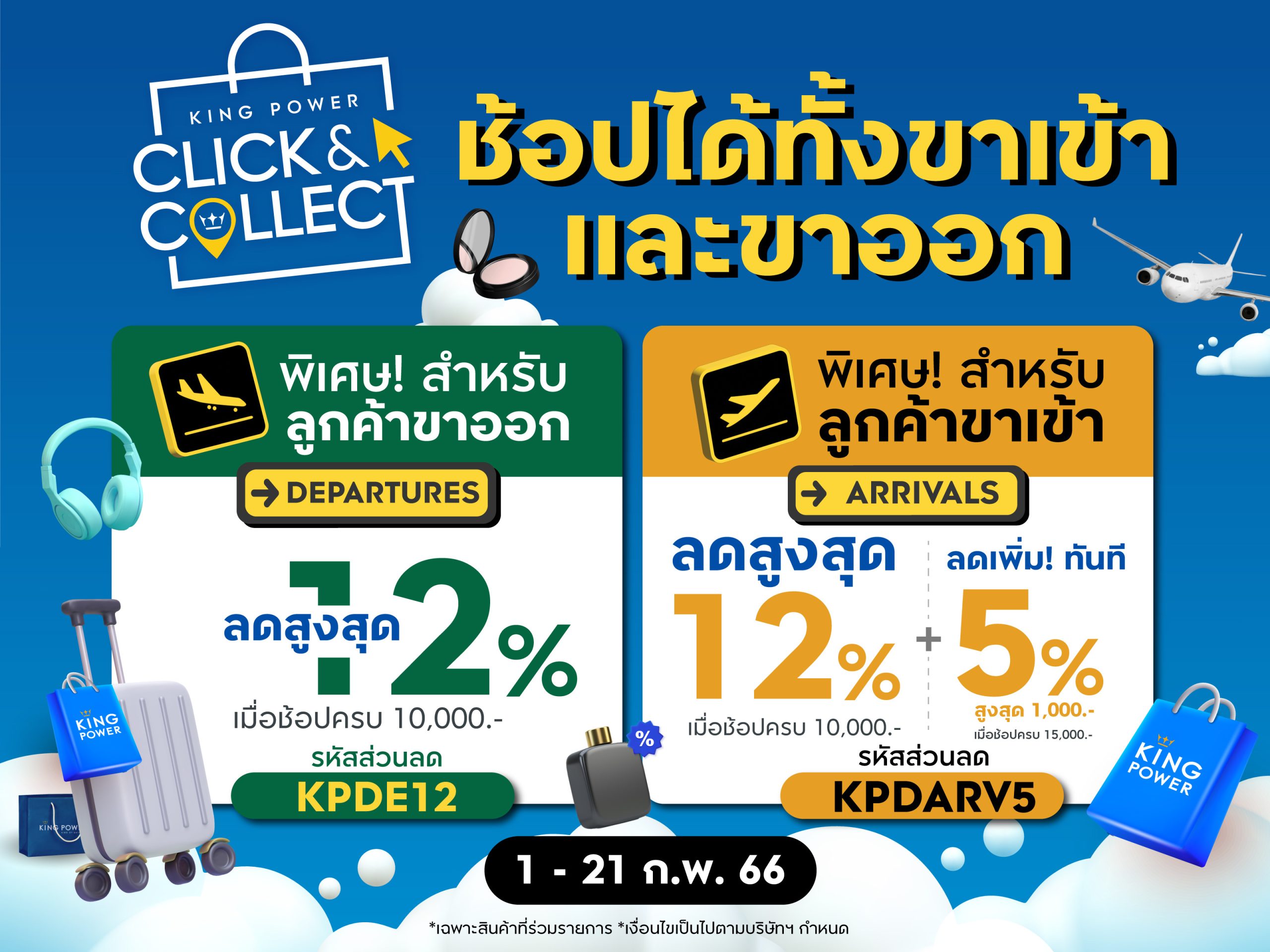 คิง เพาเวอร์ ออนไลน์ ชวนช้อปก่อนบิน ในแคมเปญ KING POWER CLICK & COLLECT แค่มีไฟลต์บินก็ช้อปง่ายๆ กับสินค้าแบรนด์เนมในราคาดิวตี้ ฟรี พร้อมส่วนลดสูงสุด 12% ตั้งแต่วันที่ 1 –21กุมภาพันธ์ 2566 ที่ www.kingpower.com หรือ คิง เพาเวอร์ แอปพลิเคชัน