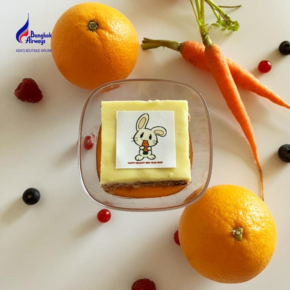 บริษัท การบินกรุงเทพ จำกัด (มหาชน) หรือสายการบินบางกอกแอร์เวย์ส ร่วมเฉลิมฉลองเทศกาลแห่งรอยยิ้มสู่ศักราชใหม่ให้ก้าวไปอย่างราบรื่น ด้วยบริการเสิร์ฟเมนูขนมหวาน ‘เค้กแครอทหน้าคัสตาร์ดในซอสส้ม’ (Carrot Cake with Custard & Orange Glaze) ที่ตกแต่งลงบนหน้าเค้กด้วยลวดลายสัญลักษณ์ประจำปีนักษัตร 2566 รูปแสตมป์การ์ตูนกระต่ายร่าเริง