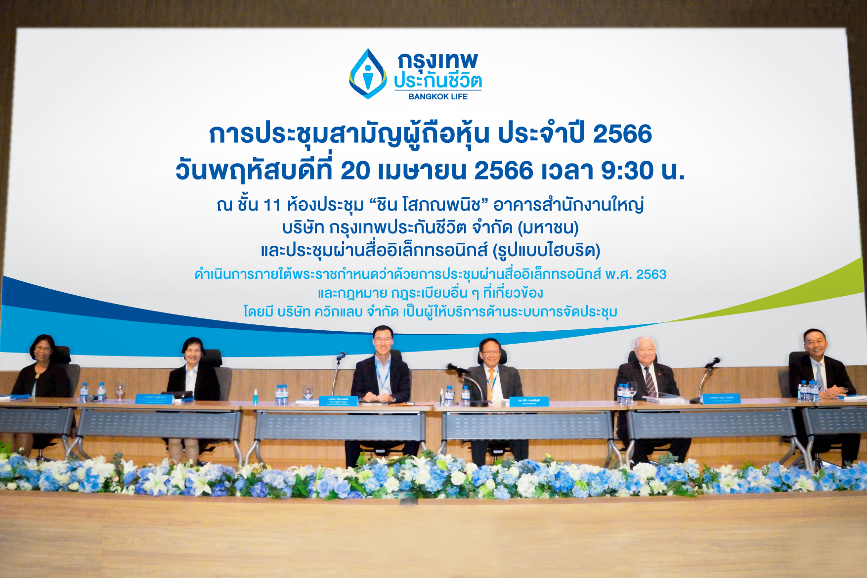 บริษัท กรุงเทพประกันชีวิต จำกัด (มหาชน) หรือ Bangkok Life Assurance จัดประชุมสามัญผู้ถือหุ้น ประจำปี 2566 เพื่อรายงานผลดำเนินงานและการพัฒนาเพื่อการเติบโตอย่างยั่งยืนของธุรกิจ ในรูปแบบไฮบริด ณ ห้องประชุม ชิน โสภณพนิช อาคารสำนักงานใหญ่ บริษัท กรุงเทพประกันชีวิต จำกัด (มหาชน) และผ่านสื่ออิเล็กทรอนิกส์ (E-AGM) เมื่อวันพฤหัสบดีที่ 20 เมษายน 2566 โดยมี ดร. ศิริ การเจริญดี ประธานกรรมการ และกรรมการอิสระ เป็นประธานในการประชุม พร้อมด้วย นายโชน โสภณพนิช กรรมการผู้จัดการใหญ่และประธานเจ้าหน้าที่บริหาร นายสุนทร อรุณานนท์ชัย ประธานกรรมการตรวจสอบ