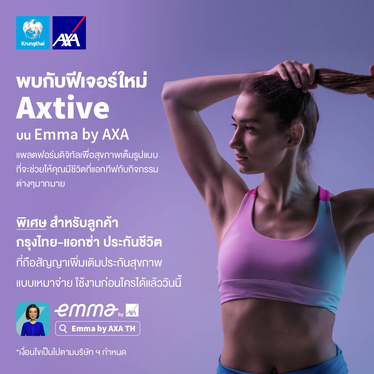 บมจ. กรุงไทย-แอกซ่า ประกันชีวิต ตอกย้ำการเป็นผู้นำด้านดิจิทัล เปิดตัว “Axtive” แพลตฟอร์มดิจิทัลเพื่อสุขภาพเต็มรูปแบบ (Digital Wellness Platform) ในแอปพลิเคชัน Emma by AXA ที่จะช่วยส่งเสริมการใช้ชีวิตที่แอกทีฟ ตัวช่วยสำคัญที่คอยติดตามและตรวจสอบสุขภาพของคุณ เพื่อให้คุณปรับเปลี่ยนไลฟ์สไตล์ให้มีสุขภาพที่ดีขึ้น และสอดคล้องกับกิจกรรมที่คุณต้องการทำในแต่ละวัน เพราะที่ กรุงไทย-แอกซ่า ประกันชีวิต เชื่อว่าการมีสุขภาพกาย สุขภาพจิตใจที่แข็งแรง จะเป็นพื้นฐานของการใช้ชีวิตอย่างมีความสุข
