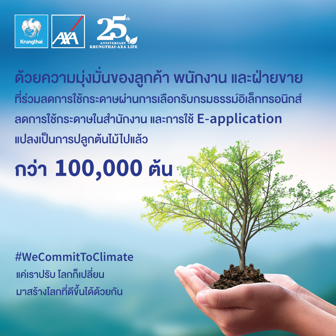 ซึ่งทุก 10 E-application จะเปลี่ยนเป็นการปลูกต้นไม้ 1 ต้น และสุดท้ายสำหรับลูกค้า ที่เลือกรับกรมธรรม์อิเล็กทรอนิกส์ (E-policy) แทนกรมธรรม์กระดาษ ทุก 1 กรมธรรม์จะแปลงเป็นการปลูกต้นไม้ 1 ต้น ซึ่งกิจกรรมดังกล่าวสอดคล้องกับนโยบายของบริษัทฯ ที่มุ่งมั่นอยู่เคียงข้าง คุ้มครอง พร้อมใส่ใจ สิ่งแวดล้อม #WeCommitToClimate แค่เราปรับ โลกก็เปลี่ยน มาสร้างโลกที่ดีขึ้นไปด้วยกัน