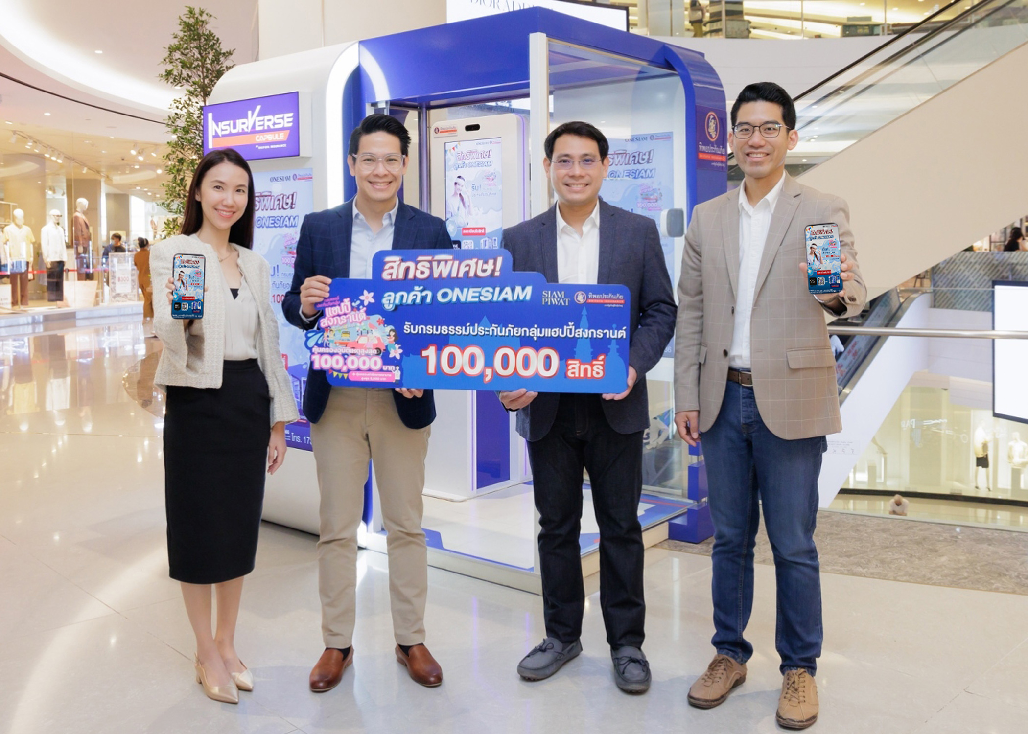 ดร.พลรัตน์ เอกโยคยะ รองกรรมการผู้จัดการใหญ่ ด้านการขายและการตลาด 2 คุณณัฐพล อังควานิช ผู้อำนวยการ ฝ่ายพัฒนาธุรกิจและการตลาด บริษัท ทิพยประกันภัย จำกัด (มหาชน) ร่วมกับ คุณปานเทพย์ นิลสินธพ ประธานบริหารสายงานประสบการณ์ลูกค้า คุณธรรมาภรณ์ โชติปัญจรัตน์ Group Head – Customer Loyalty Management บริษัท สยามพิวรรธน์ จำกัด ส่งมอบความห่วงใยในช่วงเทศกาลสงกรานต์ ให้เดินทางท่องเที่ยวอย่างอุ่นใจ ด้วยประกันภัยอุบัติเหตุ คุ้มครองสูงสุด 100,000 บาท นาน 30 วัน จำนวน 100,000 สิทธิ์ ท่านสามารถลงทะเบียนรับสิทธิ์ได้ที่ ONESIAM SuperApp และ InsurVerse Capsule by Dhipaya Insurance จำนวน 8 จุด ภายในศูนย์การค้าเครือสยามพิวรรธน์ อาทิ สยามพารากอน สยามเซ็นเตอร์ และไอคอนสยาม โดยสามารถลงทะเบียนรับสิทธิ์ได้ตั้งแต่วันที่ 10 – 30 เมษายน 2566 หรือสอบถามรายละเอียด เพิ่มเติม โทร.1736